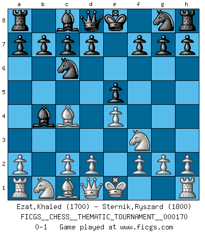 Last move : 0-1 2013 November 29 20:11:3 [Event "FICGS__CHESS__THEMATIC_TOURNAMENT__000170"] [Site "FICGS"] [Date "2013.10.19"] [Round "1"] [White "Ezat,Khaled"] [Black "Sternik,Ryszard"] [Result "0-1"] [WhiteElo "1700"] [BlackElo "1800"] 1.e4 e5 2.Nf3 Nc6 3.Bc4 Bc5 4.b4 Bxb4 0-1 This chess game has been lost on time (started : 2013.10.19 9:20:33) Evans gambit Player Black won this chess game. Follow this game move after move (download)Discovered check is the dive bomber of the Chessboard. (Reuben Fine) Obwohl ich alt bin, darf mir niemand den Finger in den Mund stecken, sonst beisse ich. (Wilhelm Steinitz) El estómago es una parte esencial del maestro de Ajedrez. (Bent Larsen) Même un GMI sait rarement calculer sur plus de cinq coups une attaque à sacrifices. (Rudolf Spielmann) There will be no order, only chaos. (Sol Robeson in Pi by Darren Aronofsky)