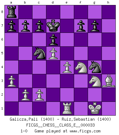 Last move : 1-0 2007 March 15 13:36:5 [Event "FICGS__CHESS__CLASS_E__000033"] [Site "FICGS"] [Date "2007.02.07"] [Round "1"] [White "Galicza,Pali"] [Black "Ruiz,Sebastian"] [Result "1-0"] [WhiteElo "1400"] [BlackElo "1400"] 1.g3 d6 2.Bg2 Bd7 3.Nf3 Bc6 4.d3 e5 5.O-O h5 6.Nc3 Na6 7.d4 Qf6 8.d5 Bd7 9.a3 Be7 10.Nd2 h4 11.Nde4 Qg6 12.Qd3 hxg3 13.Nxg3 Qg4 14.Qe4 Rh4 15.Qxg4 Rxg4 16.e4 Nc5 17.f4 exf4 18.Bxf4 Bg5 19.Nce2 Bxf4 20.Rxf4 Rxf4 21.Nxf4 Bg4 22.Re1 Kd7 23.h3 Nf6 24.hxg4 Nxg4 25.Bh3 1-0 Benko's Opening Kingside Castling by player White (move 5) Player White won this chess game. Follow this game move after move (download)Adequate compensation for a sacrifice is having a sound combination leading to a winning position; adequate compensation for a blunder is having your opponent snatch defeat from the jaws of victory. (Bruce A. Moon) Ich kenne keine einzige Person, die behaupten würde, Garri Kasparow sei ein guter Mensch (Nigel Short) Los errores estan ahí, esperando a que se cometan. (Savielly Tartakower) Tout change constamment, y compris dans le monde des Echecs. (Botvinnik) All men can see these tactics whereby I conquer, but what none can see is the strategy out of which victory is evolved. (Sun Tzu)