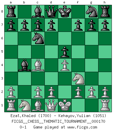 Last move : 0-1 2013 November 28 20:7:13 [Event "FICGS__CHESS__THEMATIC_TOURNAMENT__000170"] [Site "FICGS"] [Date "2013.10.19"] [Round "1"] [White "Ezat,Khaled"] [Black "Kehayov,Yulian"] [Result "0-1"] [WhiteElo "1700"] [BlackElo "1051"] 1.e4 e5 2.Nf3 Nc6 3.Bc4 Bc5 4.b4 Bxb4 0-1 This chess game has been lost on time (started : 2013.10.19 9:20:33) Evans gambit Player Black won this chess game. Follow this game move after move (download)The battle for the ultimate truth will never be won. And that's why Chess is so fascinating. (Hans Kmoch) Bobby Fischer ist kein Vorbild für die heutige Jugend. (Viktor Kortschnoi) No todos los artistas son jugadores de Ajedrez, pero todos los jugadores de Ajedrez son artistas. (Marcel Duchamp) Un millionnaire : 'Monsieur Steinitz ! Vous ne participez aux tournois que pour l'argent, alors que moi je n'y viens que pour l'honneur.' Steinitz : 'Chacun joue pour ce qu'il n'a pas'... Unless I accept my faults I will most certainly doubt my virtues. (Hugh Prather)