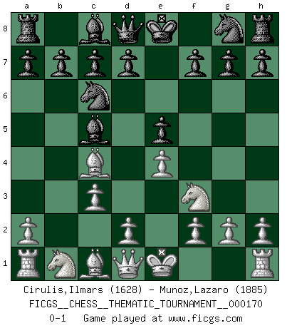 Last move : 0-1 2013 December 27 10:12:23 [Event "FICGS__CHESS__THEMATIC_TOURNAMENT__000170"] [Site "FICGS"] [Date "2013.10.19"] [Round "1"] [White "Cirulis,Ilmars"] [Black "Munoz,Lazaro"] [Result "0-1"] [WhiteElo "1628"] [BlackElo "1885"] 1.e4 e5 2.Nf3 Nc6 3.Bc4 Bc5 4.b4 Bxb4 5.c3 Bc5 0-1 Evans gambit Player Black won this chess game. Follow this game move after move (download)When your house is on fire, you can't be bothered with the neighbors. Or, as we say in Chess, if your King is under attack you don't worry about losing a Pawn on the Queen's side. (Gary Kasparov) Wenn Dein Gegner dir ein Remis anbietet, versuch herauszufinden, weshalb er glaubt schlechter zu stehen. (Nigel Short) El sobresalir en el Ajedrez es un signo de una mente intrigante. (Sir Arthur Conan Doyle) On a dit que l'homme se distingue de l'animal par le fait qu'il achète plus de livres qu'il ne peut en lire. Je voudrais suggérer qu'inclure à la liste des livres quelques livres d'échecs rendrait la distinction manifeste. (Edward Lasker) It's not the size of the dog in the fight, it's the size of the fight in the dog. (Mark Twain)