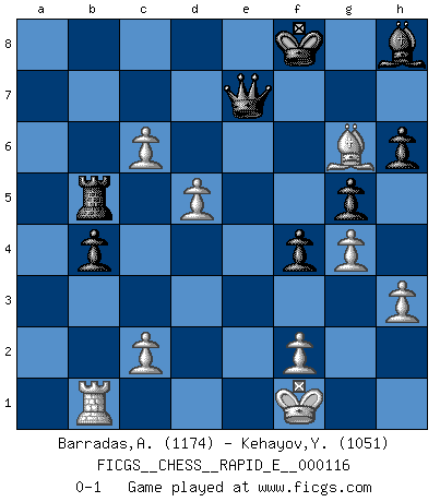 Last move : 0-1 2013 October 29 20:54:36 [Event "FICGS__CHESS__RAPID_E__000116"] [Site "FICGS"] [Date "2013.10.20"] [Round "1"] [White "Barradas,Anderson"] [Black "Kehayov,Yulian"] [Result "0-1"] [WhiteElo "1174"] [BlackElo "1051"] 1.e4 e5 2.Nf3 d6 3.h3 Nf6 4.d3 Be7 5.Nc3 O-O 6.Be2 c6 7.a3 a6 8.b4 b5 9.Be3 a5 10.O-O axb4 11.axb4 Rxa1 12.Qxa1 Na6 13.Qa3 c5 14.Nxb5 cxb4 15.Qa1 d5 16.Nxe5 Nd7 17.Nc6 Qe8 18.exd5 Bb7 19.d4 h6 20.Nba7 Ndb8 21.Nxb8 Qxb8 22.Nc6 Bxc6 23.dxc6 Nc7 24.Bf4 Qb6 25.Bxc7 Qxc7 26.d5 Rd8 27.Bf3 Qd6 28.Rb1 Rb8 29.Qa7 Bf6 30.Be4 Be5 31.Kf1 f5 32.Bf3 g5 33.g4 f4 34.Be4 Rb5 35.Qh7+ Kf8 36.Bg6 Qe7 37.Qh8+ Bxh8 0-1 Philidor's defense Kingside Castling by player Black (move 5) Kingside Castling by player White (move 10) Player Black won this chess game. Follow this game move after move (download)In the perfect Chess combination as in a first-rate short story, the whole plot and counter-plot should lead up to a striking finale, the interest not being allayed until the very last moment. (Yates and Winter) Frage: Gibt es etwas was Sie mehr lieben als Autobahnen ohne Tempobegrenzungen? - Antwort: Deutsche Frauen ohne Tempobegrenzungen. (Loek van Wely) Las leyes del Ajedrez no permiten una libre elección: tienes que mover quieras o no. (Emanuel Lasker) Les Echecs sont et restent toujours un combat, un combat intégral comme la boxe, la lutte ou un autre sport, et où il doit y avoir un vainqueur et un vaincu. (Joseph Emil Diemer) 98% of all statistics are made up. (Author unknown)