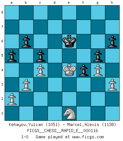 Last move : 1-0 2013 October 29 21:51:5 [Event "FICGS__CHESS__RAPID_E__000116"] [Site "FICGS"] [Date "2013.10.20"] [Round "1"] [White "Kehayov,Yulian"] [Black "Marcel,Alexis"] [Result "1-0"] [WhiteElo "1051"] [BlackElo "1138"] 1.d4 f5 2.Nc3 Nf6 3.e3 g6 4.Nf3 Bg7 5.Be2 O-O 6.O-O d6 7.Bd3 Re8 8.h3 e5 9.dxe5 dxe5 10.Bc4+ Kh8 11.b3 Qxd1 12.Rxd1 e4 13.Ne1 Nbd7 14.f3 exf3 15.Nxf3 Nb6 16.Bf1 Be6 17.Re1 Nbd5 18.Nxd5 Nxd5 19.Rb1 Nc3 20.Bb2 Nxb1 21.Bxg7+ Kxg7 22.Rxb1 Rad8 23.c4 Bf7 24.Ng5 Rxe3 25.Nf3 Rd2 26.Nxd2 a6 27.Kf2 Re6 28.Nf3 h6 29.Nd4 Re4 30.Nf3 Kf6 31.Re1 Re6 32.Rxe6+ Kxe6 33.Ke3 Kd6 34.Kd4 c5+ 35.Ke3 a5 36.Kf4 b6 37.Bd3 Ke6 38.g4 g5+ 39.Kg3 f4+ 40.Kg2 Kf6 41.Bf5 Be6 42.Bxe6 Kxe6 43.Kf2 Kf6 44.Ke2 Ke6 45.Kd3 Kd6 46.Ke4 Ke6 47.Ne1 1-0 Dutch Kingside Castling by player Black (move 5) Kingside Castling by player White (move 6) Player White won this chess game. Follow this game move after move (download)Fischer is completely natural. He plays no roles. He's like a child. Very, very simple. (Zita Rajcsanyi) Heutzutage gewinnt im Turnier nicht derjenige Spieler, der weitreichende Pläne entwirft, sondern einfach jener, der Zug um Zug kämpft. (David Bronstein) Fischer es el jugador mas fuerte del mundo. De hecho, el jugador mas fuerte que jamas haya existido. (Larry Evans) J'ai toujours senti une vague pitié pour l'homme qui ne connaît rien aux échecs, tout comme j'en aurais pour un homme ignorant de l'amour. Les Echecs, comme la musique ou comme l'amour, ont le pouvoir de rendre heureux. (Siegbert Tarrasch) Life is like a ten-speed bicycle: most of us have gears we never use. (Charles M. Schulz)