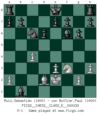 Last move : 0-1 2007 March 9 23:26:53 [Event "FICGS__CHESS__CLASS_E__000033"] [Site "FICGS"] [Date "2007.02.07"] [Round "1"] [White "Ruiz,Sebastian"] [Black "von Buttlar,Paul"] [Result "0-1"] [WhiteElo "1400"] [BlackElo "1400"] 1.Nc3 c5 2.e3 Nc6 3.Bb5 g6 4.Ba4 Bg7 5.Ne4 d6 6.Qf3 Nf6 7.d4 Nxe4 8.Qxe4 Qa5+ 9.Bd2 Qxa4 10.b3 Qa6 11.Nf3 Bf5 12.Qd5 cxd4 13.Qc4 Qxc4 14.bxc4 dxe3 15.fxe3 Bxa1 16.Ke2 Bf6 17.h3 Bxc2 18.Rc1 Be4 19.Rb1 Bxb1 0-1 Dunst (Sleipner, Heinrichsen) Opening Player Black won this chess game. Follow this game move after move (download)The most powerful weapon in Chess is to have the next move. (David Bronstein) Warum muß ich gegen diesen IDIOTEN verlieren? (Aaron Nimzowitsch) Si tu oponente te ofrece un empate, trata de averiguar porque piensa él que esta en una posición peor. (Nigel Short) Même si vous avez un bon coup à faire, regardez toujours s'il n'y en a pas un qui lui soit préférable. (Pedro Damiano) History is the quarrels of popes and kings, with wars or pestilences in every page; the men all so good for nothing, and hardly any women at all. (Jane Austen)