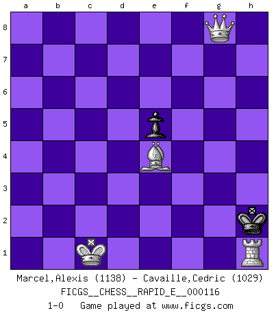 Last move : 1-0 2013 October 21 21:41:4 [Event "FICGS__CHESS__RAPID_E__000116"] [Site "FICGS"] [Date "2013.10.20"] [Round "1"] [White "Marcel,Alexis"] [Black "Cavaille,Cedric"] [Result "1-0"] [WhiteElo "1138"] [BlackElo "1029"] 1.f4 f5 2.e4 fxe4 3.d3 exd3 4.Bxd3 g6 5.f5 e6 6.fxg6 Nf6 7.gxh7 Qe7 8.Bg6+ Kd8 9.Bg5 Nc6 10.a3 Ne5 11.Bd3 d6 12.Nf3 Qg7 13.Nxe5 dxe5 14.Bxf6+ Qxf6 15.Bb5 Ke7 16.Qh5 c6 17.Rf1 Qg7 18.Qh4+ Kd7 19.Bd3 Bd6 20.Qh5 Ke7 21.Nc3 Bd7 22.Ne4 Qxh7 23.Qxh7+ Rxh7 24.Nxd6 Rxh2 25.Ne4 Rxg2 26.O-O-O b5 27.Nc5 a5 28.Be4 Rd8 29.Nxd7 Rxd7 30.Bxg2 Rxd1+ 31.Rxd1 Kf6 32.Bxc6 b4 33.axb4 axb4 34.c3 bxc3 35.bxc3 Kf5 36.Rf1+ Kg5 37.c4 e4 38.Bxe4 e5 39.c5 Kg4 40.c6 Kg3 41.c7 Kh2 42.c8Q Kg3 43.Qg8+ Kh2 44.Rh1+ 1-0 Bird's Opening Queenside Castling by player White (move 26) 10 pieces endgame at move 33 : White KRBPPP , Black KPPP WHITE : King + 1 Rook 1 Bishop 3 Pawns BLACK : King + 3 Pawns 9 pieces endgame at move 33 : White KRBPP , Black KPPP WHITE : King + 1 Rook 1 Bishop 2 Pawns BLACK : King + 3 Pawns 8 pieces endgame at move 34 : White KRBP , Black KPPP WHITE : King + 1 Rook 1 Bishop 1 Pawn BLACK : King + 3 Pawns 7 pieces endgame at move 35 : White KRBP , Black KPP WHITE : King + 1 Rook 1 Bishop 1 Pawn BLACK : King + 2 Pawns 6 pieces endgame at move 38 : White KRBP , Black KP WHITE : King + 1 Rook 1 Bishop 1 Pawn BLACK : King + 1 Pawn Promotion Queen by player White (move 42) Player White won this chess game. Follow this game move after move (download)Chess is so inspiring that I do not believe a good player is capable of having an evil thought during the game. (Wilhelm Steinitz) Es hat in meinem Leben Zeiten gegeben, in denen das Schachspiel, wenn nicht zum Lebenszweck, so doch zu einem regelrechten Lebensersatz geworden ist. Man fühlt sich in solchen Zeiten nicht so, als besäße man eine göttliche Gabe, sondern eher so, als sei man von ihr besessen. (Garry Kasparov) Si tu oponente te ofrece un empate, trata de averiguar porque piensa él que esta en una posición peor. (Nigel Short) Karpov est une pièce de musée. (Garry Kasparov) There's always a bigger fish. (Qui-Gon Jinn in Star Wars ep.1)