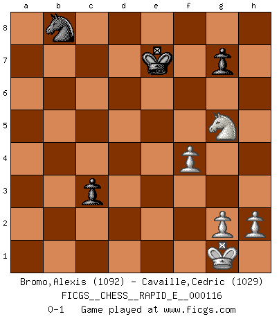 Last move : 0-1 2013 October 23 5:53:44 [Event "FICGS__CHESS__RAPID_E__000116"] [Site "FICGS"] [Date "2013.10.20"] [Round "1"] [White "Bromo,Alexis"] [Black "Cavaille,Cedric"] [Result "0-1"] [WhiteElo "1092"] [BlackElo "1029"] 1.d4 d5 2.c4 dxc4 3.Nc3 c6 4.Nf3 a6 5.e4 Nf6 6.Bxc4 b5 7.Bb3 e6 8.Bg5 Be7 9.Bxf6 Bxf6 10.e5 Be7 11.a3 c5 12.d5 exd5 13.Bxd5 Ra7 14.O-O Bb7 15.Bxb7 Qxd1 16.Raxd1 Rxb7 17.Rfe1 O-O 18.Ne4 c4 19.Nfg5 Bxg5 20.Nxg5 a5 21.e6 fxe6 22.Nxe6 Re8 23.Nc5 Rxe1+ 24.Rxe1 Rc7 25.Ne6 Re7 26.f4 Kf7 27.Ng5+ Ke8 28.Rxe7+ Kxe7 29.Nxh7 b4 30.axb4 axb4 31.Ng5 c3 32.bxc3 bxc3 0-1 Queen's gambit accepted Kingside Castling by player White (move 14) Kingside Castling by player Black (move 17) 10 pieces endgame at move 32 : White KNPPPP , Black KNPP WHITE : King + 1 Knight 4 Pawns BLACK : King + 1 Knight 2 Pawns 9 pieces endgame at move 32 : White KNPPP , Black KNPP WHITE : King + 1 Knight 3 Pawns BLACK : King + 1 Knight 2 Pawns Player Black won this chess game. Follow this game move after move (download)Chess is the art which expresses the science of logic. (Mikhail Botvinnik) Alles was ich jemals tun will ist Schach spielen. (Robert James Fischer) Por esta medida (el intervalo entre Fischer y sus contemporaneos), yo le considero el mas grande campeón mundial. (Garry Kasparov) La menace est plus forte que l'exécution. (Aaron Nimzovitch) The mind is like a parachute, it only functions when its open. (Unknown)