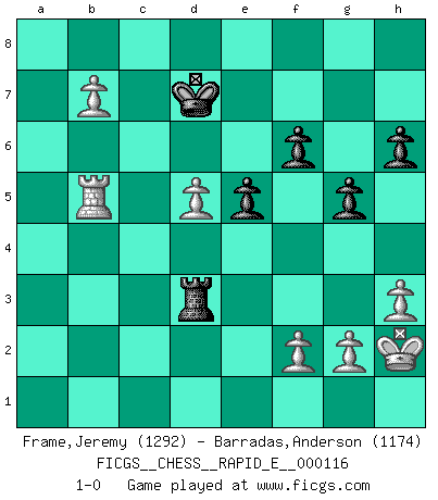 Last move : 1-0 2013 October 21 21:7:20 [Event "FICGS__CHESS__RAPID_E__000116"] [Site "FICGS"] [Date "2013.10.20"] [Round "1"] [White "Frame,Jeremy"] [Black "Barradas,Anderson"] [Result "1-0"] [WhiteElo "1292"] [BlackElo "1174"] 1.e4 c5 2.Nf3 d6 3.Bc4 a6 4.c3 Bd7 5.d4 b5 6.Bb3 c4 7.Bc2 Bg4 8.Nbd2 e5 9.d5 Be7 10.O-O Nf6 11.h3 Bxf3 12.Nxf3 Nbd7 13.Bg5 Nc5 14.Qe2 h6 15.Bxf6 Bxf6 16.b3 cxb3 17.axb3 O-O 18.Ra2 Qb6 19.Rfa1 Rfc8 20.Qe3 Qb7 21.b4 Nd7 22.Ra3 Nb6 23.Bd3 Na4 24.Be2 Rc7 25.Nd2 Bg5 26.Qd3 Nb2 27.Qc2 Bxd2 28.Qxd2 Nc4 29.Bxc4 Rxc4 30.Qa2 Rxe4 31.Rxa6 Rxa6 32.Qxa6 Qxa6 33.Rxa6 Re1+ 34.Kh2 Rc1 35.Rxd6 Rxc3 36.Rb6 Rd3 37.Rxb5 f6 38.Rc5 g5 39.b5 Kf7 40.b6 Ke7 41.Rb5 Kd7 42.b7 1-0 Sicilian Kingside Castling by player White (move 10) Kingside Castling by player Black (move 17) Player White won this chess game. Follow this game move after move (download)Chess is ruthless: you've got to be prepared to kill people. (Nigel Short) Es genügt nicht ein guter Spieler zu sein, man muß auch gut spielen. (Siegbert Tarrasch) Un buen sacrificio es aquel que aunque no sea necesariamente sólido, deja a tu oponente aturdido y confuso. (Rudolph Spielmann) Echiquier : carré parfait, comme la Jérusalem nouvelle décrite par l'auteur de l'Apocalypse, huit cases sur huit, exaltation du chiffre 4, symbole du cosmos aux quatre horizons... où le noir et le blanc, l'ombre et la lumière, le mal et le bien s'entremêlent et se conjuguent. (Robert Couffignal, Le Gambit du poète) My poor ole parrot... Is not in the circulation of displays ....poo hoo hoo :) (Wayne Lowrance's enigma)