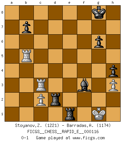 Last move : 0-1 2013 October 23 21:9:13 [Event "FICGS__CHESS__RAPID_E__000116"] [Site "FICGS"] [Date "2013.10.20"] [Round "1"] [White "Stoyanov,Zdravko"] [Black "Barradas,Anderson"] [Result "0-1"] [WhiteElo "1221"] [BlackElo "1174"] 1.e4 c5 2.Nf3 d6 3.h3 a6 4.a3 e5 5.d3 Nf6 6.Bg5 Be7 7.Be2 Nh5 8.Be3 Nc6 9.Nxe5 Nxe5 10.Bxh5 g6 11.Be2 Bd7 12.Nc3 Bc6 13.f4 Nd7 14.Bg4 Bh4+ 15.Bf2 Bxf2+ 16.Kxf2 Nf6 17.b4 h5 18.Bf3 cxb4 19.axb4 Qb6+ 20.Ke2 Qxb4 21.Rb1 Qxc3 22.Rb3 Qa5 23.Qc1 O-O 24.f5 d5 25.Ra3 Qc5 26.Qb2 dxe4 27.Bxe4 Nxe4 28.dxe4 Bxe4 29.fxg6 fxg6 30.Rc3 Qb5+ 31.Qxb5 axb5 32.Rb1 Ra4 33.Rxb5 Bxg2 34.Kd2 Rd8+ 35.Ke3 Re4+ 36.Kf2 Rd2+ 37.Kg3 h4+ 38.Kh2 Bf3 39.Kg1 Re1+ 0-1 Sicilian Kingside Castling by player Black (move 23) Player Black won this chess game. Follow this game move after move (download)I prefer to lose a really good game than to win a bad one. (David Levy) Moralische Siege zählen nicht. (Savielly Grigorievitsch Tartakower) Cuando me preguntan: -¿Cual es el secreto que te hace hacer mejores movidas que tus oponentes?, Yo respondo: Me da gusto que me pregunten eso, porque, como veran, hay una simple razón. Yo pienso mis propias movidas y dejo a mi oponente que el piense las suyas. (Alexander Alekhine) Nous vivons dans un monde échiquéen : chaque jour qui passe est un défi à relever. (Philosophe Sasha) Art is not a thing, it is a way. (Elbert Hubbard)