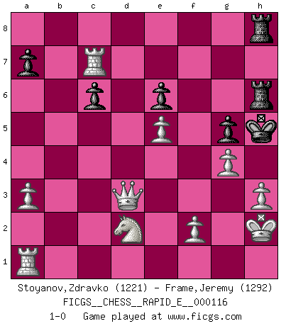 Last move : 1-0 2013 October 21 21:27:35 [Event "FICGS__CHESS__RAPID_E__000116"] [Site "FICGS"] [Date "2013.10.20"] [Round "1"] [White "Stoyanov,Zdravko"] [Black "Frame,Jeremy"] [Result "1-0"] [WhiteElo "1221"] [BlackElo "1292"] 1.e4 e5 2.Nf3 Nc6 3.Bb5 Nf6 4.Bxc6 dxc6 5.h3 Bd6 6.d3 O-O 7.O-O h6 8.Be3 Be6 9.Qd2 Qd7 10.Kh2 Rad8 11.a3 Nh5 12.Bxh6 Nf4 13.Bxf4 exf4 14.Re1 g6 15.e5 Bc5 16.c3 Qxd3 17.Qxf4 Qf5 18.Qh4 Kg7 19.Qg3 Rh8 20.Nbd2 Be7 21.Red1 Bh4 22.Nxh4 Qc2 23.Nhf3 Rh6 24.Nd4 Qxb2 25.Rdb1 Qxc3 26.Qxc3 Rdh8 27.Nxe6+ fxe6 28.Rxb7 g5 29.Rxc7+ Kg6 30.Qd3+ Kh5 31.g4+ 1-0 Ruy Lopez : Berlin defense Kingside Castling by player Black (move 6) Kingside Castling by player White (move 7) Player White won this chess game. Follow this game move after move (download)Chess is the gymnasium of the mind. (Blaise Pascal) Kasparov ist eine Art Monster mit hundert Augen, denen auch nicht das Geringste entgeht. (Tony Miles) El poder defensivo de una pieza clavada, solamente es imaginario. (Aaron Nimzovich) Des idées, des idées, j'en ai cent, j'en ai mille. Des bonnes, des mauvaises, applicables, irréalisables... Il suffit de faire le tri ! (Roos) Now the reason the enlightened prince and the wise general conquer the enemy whenever they move and their achievements surpass those of ordinary men is foreknowledge. (Sun Tzu)