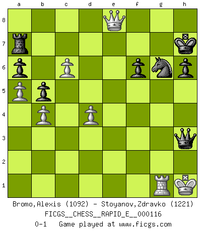 Last move : 0-1 2013 October 25 19:54:27 [Event "FICGS__CHESS__RAPID_E__000116"] [Site "FICGS"] [Date "2013.10.20"] [Round "1"] [White "Bromo,Alexis"] [Black "Stoyanov,Zdravko"] [Result "0-1"] [WhiteElo "1092"] [BlackElo "1221"] 1.d4 d5 2.c4 e6 3.Nc3 Bb4 4.Bd2 Ne7 5.c5 Nbc6 6.a3 Bxc3 7.Bxc3 h6 8.Nf3 O-O 9.e3 Re8 10.Bd3 Bd7 11.h3 a6 12.b4 b5 13.a4 Na7 14.O-O Nec6 15.a5 Nc8 16.Qc2 Qf6 17.Ne5 Nxe5 18.dxe5 Qg5 19.f4 Qh4 20.Be1 Qd8 21.f5 exf5 22.Bxf5 Bxf5 23.Rxf5 Ne7 24.Rh5 Ng6 25.Bc3 c6 26.Rf1 Qb8 27.e6 Rxe6 28.Qf5 Qe8 29.Bd4 Ne7 30.Qg4 Rg6 31.Qf4 f6 32.Rf3 Rxg2+ 33.Kxg2 Qxh5 34.Bxf6 Ng6 35.Qd6 gxf6 36.Rg3 Qe2+ 37.Kg1 Qe1+ 38.Kh2 Qf2+ 39.Rg2 Qf5 40.Qxc6 Ra7 41.Qe8+ Kh7 42.c6 d4 43.exd4 Qf4+ 44.Kh1 Qf1+ 45.Rg1 Qxh3+ 0-1 QGD : 3.Nc3 Kingside Castling by player Black (move 8) Kingside Castling by player White (move 14) Player Black won this chess game. Follow this game move after move (download)In a gambit you give up a Pawn for the sake of getting a lost game. (Samuel Standige Boden) Es ist schade, dass viele Schachsportler vergessen, wie wichtig Auftreten und angemessene Kleidung sind. (Alexandra Kosteniuk) El Ajedrez es el arte del análisis. (Mikhail Botvinnik) Ce qui est bien, c'est d'avoir tout un tas de pièces en prise : l'adversaire ne peut en prendre qu'une à la fois. Cité par Thierry Audin. Hardware: the parts of a computer that can be kicked. (Jeff Persis)