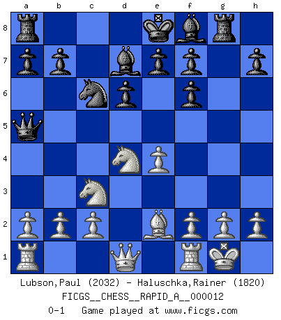 Last move : 0-1 2007 April 8 10:19:55 [Event "FICGS__CHESS__RAPID_A__000012"] [Site "FICGS"] [Date "2007.02.07"] [Round "1"] [White "Lubson,Paul"] [Black "Haluschka,Rainer"] [Result "0-1"] [WhiteElo "2032"] [BlackElo "1820"] 1.e4 c5 2.Nf3 d6 3.d4 Nf6 4.Nc3 cxd4 5.Nxd4 Nc6 6.Bg5 Bd7 7.Be2 Qa5 8.Bxf6 gxf6 9.O-O Rg8 0-1 This chess game has been lost on time (started : 2007.02.07 21:3:10) Sicilian Kingside Castling by player White (move 9) Player Black won this chess game. Follow this game move after move (download)First-class players lose to second class players because second-class players sometimes play a first-class game. (Tarrasch) Ich bin Weltmeister und muß mit niemandem irgend etwas diskutieren. (Viswanathan Anand) Te sientas frente a un tablero y repentinamente tu corazón brinca. Tu mano tiembla al tomar una pieza y moverla. Pero lo que el Ajedrez te enseña es que tu debes permanecer ahí con calma y pensar de que si realmente es una buena idea o de que si hay otras ideas mejores. (Stanley Kubrick) Nous vivons dans un monde échiquéen : chaque jour qui passe est un défi à relever. (Philosophe Sasha) Tomorrow's what you make of it. (Horatio Caine, C.S.I. Miami)