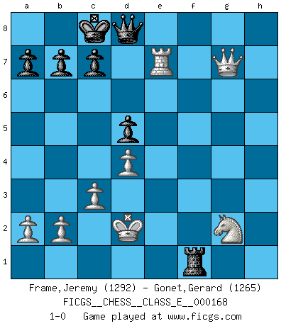Last move : 1-0 2013 October 21 21:21:23 [Event "FICGS__CHESS__CLASS_E__000168"] [Site "FICGS"] [Date "2013.10.20"] [Round "1"] [White "Frame,Jeremy"] [Black "Gonet,Gerard"] [Result "1-0"] [WhiteElo "1292"] [BlackElo "1265"] 1.e4 Nc6 2.d4 d5 3.e5 f6 4.f4 Nh6 5.c3 Bf5 6.Bd3 Qd7 7.Nf3 e6 8.Bxf5 Nxf5 9.g4 Nh6 10.Nh4 O-O-O 11.Be3 Be7 12.Qe2 fxe5 13.g5 exf4 14.Bxf4 Rhf8 15.Ng2 Nf7 16.h4 h6 17.Nd2 hxg5 18.hxg5 Bxg5 19.Bxg5 Nxg5 20.O-O-O Ne7 21.Rde1 Rf6 22.Rhf1 Rdf8 23.Rxf6 Rxf6 24.Qe5 Nf7 25.Qh5 Rf5 26.Qh3 Ng5 27.Qh8+ Qd8 28.Qxg7 Nf3 29.Rxe6 Nxd2 30.Rxe7 Rf1+ 31.Kxd2 1-0 KP : Nimzovich defense Queenside Castling by player Black (move 10) Queenside Castling by player White (move 20) Player White won this chess game. Follow this game move after move (download)The passed Pawn is a criminal, who should be kept under lock and key. Mild measures, such as police surveillance, are not sufficient. (Aaron Nimzovich) Wie kann ich Remis annehmen? Ich weiß ja gar nicht, wie ich stehe! (Fritz Sämisch) No soy una persona materialista y por eso, no resiento la falta o pérdida del dinero. La ausencia de cosas mundanas carece de importancia. Ya que el Ajedrez es una forma en la que puedo ser tan materialista como yo desee sin tener la necesidad de vender mi alma. (Jamie Walter Adams) A ce moment-là, je menaçais de comprendre la position ! (Clément L'Heureux) Programming can only do so much before it becomes too much. (Don Groves)