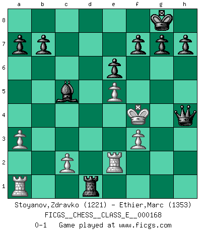 Last move : 0-1 2014 February 11 8:48:13 [Event "FICGS__CHESS__CLASS_E__000168"] [Site "FICGS"] [Date "2013.10.20"] [Round "1"] [White "Stoyanov,Zdravko"] [Black "Ethier,Marc"] [Result "0-1"] [WhiteElo "1221"] [BlackElo "1353"] 1.e4 c6 2.Nf3 d5 3.e5 c5 4.h3 Nc6 5.Bb5 Bd7 6.d3 Qa5+ 7.Nc3 d4 8.Bxc6 Bxc6 9.Bd2 dxc3 10.Bxc3 Qc7 11.O-O e6 12.a3 Ne7 13.Re1 Rd8 14.b4 Nd5 15.Qd2 Nxc3 16.Qxc3 Bxf3 17.gxf3 Be7 18.f4 O-O 19.d4 Rxd4 20.bxc5 Rxf4 21.f3 Bxc5+ 22.Kf1 Qe7 23.Re4 Qh4 24.Re2 Qxh3+ 25.Ke1 Qh1+ 26.Kd2 Rd8+ 27.Qd3 Rxd3+ 28.Kxd3 Rd4+ 29.Ke3 Rd1 30.Kf4 Qh4+ 0-1 Caro-Kann defense Kingside Castling by player White (move 11) Kingside Castling by player Black (move 18) Player Black won this chess game. Follow this game move after move (download)A bad day of Chess is better than any good day at work. (Anonymous) Bis jetzt ist Weiß einer wohlbekannten Analyse gefolgt. Aber jetzt begeht er einen schrecklichen Fehler: Er beginnt seinen eigenen Kopf zu benutzen. (Siegbert Tarrasch) Tu eres para mi la Reina en d8 y yo soy el Peón en d7!!. (GM Eduard Gufeld) La guerre est enfant de la passion, la passion est enfant du narcissisme et le narcissisme est l'enfant. (...) Une autre partie ? (Thibault de Vassal) The arrogant army will lose certainly the battle. (Chinese proverb)