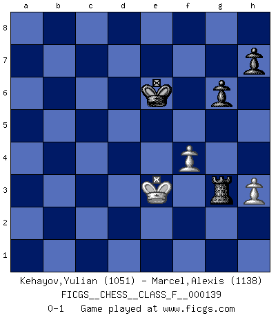 Last move : 0-1 2013 October 29 21:56:8 [Event "FICGS__CHESS__CLASS_F__000139"] [Site "FICGS"] [Date "2013.10.21"] [Round "1"] [White "Kehayov,Yulian"] [Black "Marcel,Alexis"] [Result "0-1"] [WhiteElo "1051"] [BlackElo "1138"] 1.d4 f5 2.e3 Nf6 3.Nf3 g6 4.Be2 Bg7 5.O-O O-O 6.Nc3 d6 7.h3 Re8 8.Bd3 e5 9.dxe5 dxe5 10.b3 Kh8 11.Bb2 e4 12.Be2 exf3 13.Bxf3 Nc6 14.Bxc6 bxc6 15.Qxd8 Rxd8 16.Ne2 Ba6 17.Rfe1 Bxe2 18.Rxe2 Nd5 19.Bxg7+ Kxg7 20.c4 Nc3 21.Rc2 Ne4 22.f3 Nc5 23.Re1 Rd3 24.Kf2 Rad8 25.Ke2 a5 26.Kf2 Ne6 27.R1e2 f4 28.exf4 Nxf4 29.Re7+ Kf6 30.Rxc7 Rd2+ 31.Rxd2 Rxd2+ 32.Ke3 Ne6 33.Rxc6 Rxa2 34.Ra6 Ra3 35.Ke4 Rxb3 36.Kd5 Rd3+ 37.Ke4 Rd4+ 38.Ke3 Rxc4 39.Rxa5 Rc2 40.Ra6 Rxg2 41.Rxe6+ Kxe6 42.f4 Rg3+ 0-1 Dutch Kingside Castling by player White (move 5) Kingside Castling by player Black (move 5) 10 pieces endgame at move 39 : White KRPPP , Black KRNPP WHITE : King + 1 Rook 3 Pawns BLACK : King + 1 Rook 1 Knight 2 Pawns 9 pieces endgame at move 40 : White KRPP , Black KRNPP WHITE : King + 1 Rook 2 Pawns BLACK : King + 1 Rook 1 Knight 2 Pawns 8 pieces endgame at move 41 : White KRPP , Black KRPP WHITE : King + 1 Rook 2 Pawns BLACK : King + 1 Rook 2 Pawns 7 pieces endgame at move 41 : White KPP , Black KRPP WHITE : King + 2 Pawns BLACK : King + 1 Rook 2 Pawns Player Black won this chess game. Follow this game move after move (download)Bobby Fischer is the greatest Chess genius of all time ! (Alexander Kotov) Jede Eröffnung ist gut genug um gespielt zu werden, wenn nur ihr Ruf schlecht genug ist. (Savielly Grigorievitsch Tartakower) Tu cuerpo tiene que estar en óptima condición. Tu Ajedrez se deteriora como lo hace tu cuerpo. No puedes separar la mente y el cuerpo. (Bobby Fischer) Les Echecs, c'est l'art de la guerre sans les charniers, c'est la résurrection des morts tombés au champ d'honneur, l'espoir perpétuel, la suprématie de l'intelligence sur la force, la culture de l'esprit. (F. Szpiner) Those who make the worst use of their time are the first to complain of its brevity. (Jean de la Bruyere)