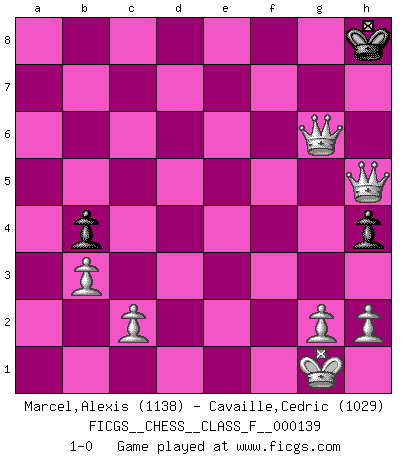 Last move : 1-0 2013 October 22 15:19:4 [Event "FICGS__CHESS__CLASS_F__000139"] [Site "FICGS"] [Date "2013.10.21"] [Round "1"] [White "Marcel,Alexis"] [Black "Cavaille,Cedric"] [Result "1-0"] [WhiteElo "1138"] [BlackElo "1029"] 1.f4 c5 2.Nf3 d6 3.e3 Nf6 4.b3 e6 5.Bb2 Be7 6.Be2 O-O 7.O-O a6 8.Nc3 b5 9.Qe1 Bb7 10.Nd1 b4 11.a4 a5 12.Bb5 Ba6 13.Bxa6 Nxa6 14.Nf2 Nc7 15.Bxf6 Bxf6 16.Rd1 Nd5 17.Ng4 Qd7 18.Nxf6+ Nxf6 19.Ng5 h6 20.Nf3 d5 21.Ne5 Qd6 22.d3 Nd7 23.Nxd7 Qxd7 24.Qg3 f5 25.e4 fxe4 26.dxe4 d4 27.Qf3 e5 28.f5 g6 29.Qg3 Qg7 30.fxg6 Rxf1+ 31.Rxf1 Ra6 32.Qg4 Qxg6 33.Qc8+ Kg7 34.Qf8+ Kh7 35.Rf7+ Qxf7 36.Qxf7+ Kh8 37.Qe8+ Kg7 38.Qxe5+ Kf7 39.Qxc5 Re6 40.Qxa5 Rxe4 41.Qf5+ Kg7 42.Qxe4 d3 43.Qxd3 h5 44.a5 Kh6 45.a6 Kg5 46.a7 h4 47.a8Q Kg4 48.Qa8f3+ Kg5 49.Qd3f5+ Kh6 50.Qf3h5+ Kg7 51.Qh5g6+ Kh8 52.Qf5h5+ 1-0 Bird's Opening Kingside Castling by player Black (move 6) Kingside Castling by player White (move 7) 10 pieces endgame at move 43 : White KQPPPPP , Black KPP WHITE : King + 1 Queen 5 Pawns BLACK : King + 2 Pawns Promotion Queen by player White (move 47) Player White won this chess game. Follow this game move after move (download)I know people who have all the will in the world, but still can't play good Chess. (Bobby Fischer) Er war ein guter Schachspieler, aber ich kann Leute nicht ausstehen, die 'Heil Hitler' rufen (Über Alexander Aljechin). (Miguel Najdorf) Sin errores no puede haber brillantez. (Emanuel Lasker) Vous savez, camarade Pachman, je n'éprouve pas de plaisir à être ministre, je jouerais plutôt aux échecs comme vous, ou alors ferais une révolution au Venezuela. (Che Guevara à Ludek Pachman, 'Checkmate in Prague', 1975) Creativity is allowing yourself to make mistakes. Art is knowing which ones to keep. (Scott Adams)
