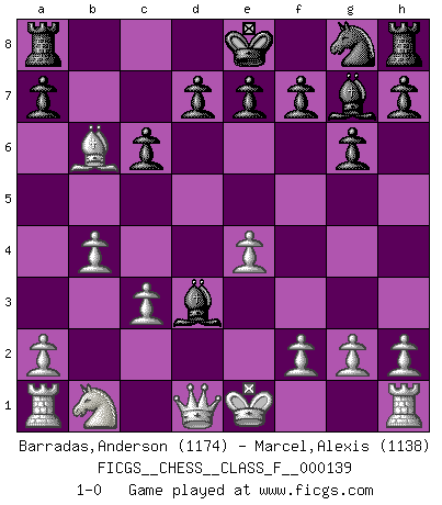 Last move : 1-0 2013 October 21 21:12:20 [Event "FICGS__CHESS__CLASS_F__000139"] [Site "FICGS"] [Date "2013.10.21"] [Round "1"] [White "Barradas,Anderson"] [Black "Marcel,Alexis"] [Result "1-0"] [WhiteElo "1174"] [BlackElo "1138"] 1.e4 g6 2.d4 Bg7 3.Nf3 c5 4.c3 cxd4 5.Nxd4 Nc6 6.Nxc6 bxc6 7.Bd3 Qa5 8.Bd2 Qb6 9.b4 Ba6 10.Be3 Bxd3 11.Bxb6 1-0 Robatsch (Modern) defense Player White won this chess game. Follow this game move after move (download)Pawn endings are to Chess what putting is to golf. (Cecil Purdy) Ich weiss nicht was Gott gegen mich auf 1.e4 antworten würde. (Robert James Fischer) Bobby es el jugador de Ajedrez mas fino que este país jamás haya producido. Su memoria para las movidas, su brillantez en soñar combinaciones y su feróz determinación por la victoria son algo extraño. (John Collins) Il n'y a plus de joueurs du niveau de Jacob Murray dont la seule quête est le beau jeu, le plaisir de voir les pièces construire quelque chose. Sur 10 idées à la minute, 9 seront sans intérêt, la dernière s'avèrera géniale. (Christian Bauer) Big Chess is a place for big hallucinations. (Thibault de Vassal)