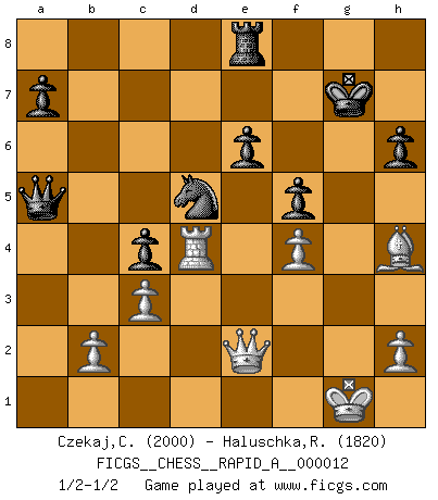 Last move : 1/2-1/2 2007 July 2 21:39:22 [Event "FICGS__CHESS__RAPID_A__000012"] [Site "FICGS"] [Date "2007.02.07"] [Round "1"] [White "Czekaj,Christophe"] [Black "Haluschka,Rainer"] [Result "1/2-1/2"] [WhiteElo "2000"] [BlackElo "1820"] 1.e4 c5 2.Nf3 d6 3.c3 Nf6 4.Be2 g6 5.O-O Bg7 6.Qc2 O-O 7.d4 cxd4 8.Nxd4 Nc6 9.Nxc6 bxc6 10.Bf4 d5 11.Nd2 Be6 12.Bf3 Qb6 13.Rfe1 Rfd8 14.exd5 Nxd5 15.Bg3 Bf5 16.Be4 Bxe4 17.Rxe4 Rd7 18.Nc4 Qa6 19.Ne5 Bxe5 20.Bxe5 c5 21.Rae1 Rad8 22.a3 c4 23.Qe2 f6 24.Bg3 Rc8 25.f4 Kg7 26.Rd4 Qb6 27.Bf2 Qb5 28.a4 Qb7 29.Red1 Qc6 30.Qe4 e6 31.g4 f5 32.gxf5 gxf5 33.Qe2 Kh6 34.Bg3 Rg7 35.a5 Rg6 36.Kf2 Qb5 37.Bh4 Kg7 38.Bg5 h6 39.Bh4 Re8 40.Rg1 Rxg1 41.Kxg1 Qxa5 1/2-1/2 Sicilian Kingside Castling by player White (move 5) Kingside Castling by player Black (move 6) This chess game ended in a draw. Follow this game move after move (download)Chess is a forcing house where the fruits of character can ripen more fully than in life. (Edward Morgan Foster) Du weisst es gibt ein Problem mit Computern und Fernschach, wenn jeder eine Rating von 2450 hat. (John Christen Knudsen) Aquel que teme a un Peón de Reina aislado, debería de retirarse del Ajedrez. (Siegbert Tarrasch) La vie et les Echecs sont tous les deux une lutte constante. (Lasker) Nowadays, anyone who cannot speak English and is incapable of using the Internet is regarded as backward. (Al-Waleed bin Talal)