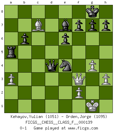 Last move : 0-1 2013 November 20 20:19:20 [Event "FICGS__CHESS__CLASS_F__000139"] [Site "FICGS"] [Date "2013.10.21"] [Round "1"] [White "Kehayov,Yulian"] [Black "Orden,Jorge"] [Result "0-1"] [WhiteElo "1051"] [BlackElo "1095"] 1.d4 d5 2.Nc3 Nf6 3.e3 e6 4.Nf3 Be7 5.Be2 O-O 6.O-O a6 7.h3 b6 8.Bd3 Bb7 9.e4 Nxe4 10.Nxe4 dxe4 11.Be2 exf3 12.Bxf3 Bxf3 13.Qxf3 Nd7 14.c4 Nf6 15.b4 Qxd4 16.Bf4 Qxc4 17.a3 Rfd8 18.Rfd1 a5 19.bxa5 Rxd1+ 20.Rxd1 Rxa5 21.Rd4 Qc5 22.g4 Qxd4 23.Bxc7 Ne4 0-1 Queen's pawn : Chigorin variation Kingside Castling by player Black (move 5) Kingside Castling by player White (move 6) Player Black won this chess game. Follow this game move after move (download)Chess is a forcing house where the fruits of character can ripen more fully than in life. (Edward Morgan Foster) Du weisst es gibt ein Problem mit Computern und Fernschach, wenn jeder eine Rating von 2450 hat. (John Christen Knudsen) El Ajedrez no es como la vida... ¡tiene reglas!. (Mark Pasternak) La vie et les Echecs sont tous les deux une lutte constante. (Lasker) Looking at the proliferation of personal web pages on the Net, it looks like very soon everyone on Earth will have 15 megabytes of fame. (M.G. Sriram)