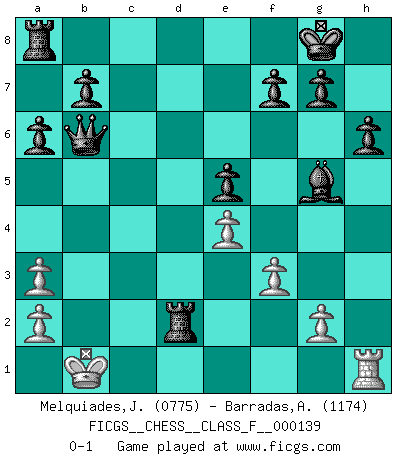 Last move : 0-1 2013 October 27 22:37:42 [Event "FICGS__CHESS__CLASS_F__000139"] [Site "FICGS"] [Date "2013.10.21"] [Round "1"] [White "Melquiades,Jay"] [Black "Barradas,Anderson"] [Result "0-1"] [WhiteElo "0775"] [BlackElo "1174"] 1.e4 c5 2.Nf3 d6 3.d4 cxd4 4.Nxd4 a6 5.c4 e5 6.Nf3 Bg4 7.h3 Bxf3 8.Qxf3 Nf6 9.Bg5 Be7 10.h4 h6 11.Bxf6 Bxf6 12.Nc3 Nd7 13.O-O-O Bxh4 14.Rxd6 Bg5+ 15.Kb1 Qc7 16.c5 Qxc5 17.Qd3 Nb6 18.Be2 O-O 19.Nd5 Qxd6 20.Nf6+ Qxf6 21.f3 Rfd8 22.Qb3 Rd2 23.Bc4 Nxc4 24.Qa3 Nxa3+ 25.bxa3 Qb6+ 0-1 Sicilian Queenside Castling by player White (move 13) Kingside Castling by player Black (move 18) Player Black won this chess game. Follow this game move after move (download)Chess, like love, like music, has the power to make people happy. (Siegbert Tarrasch) Ein Springer auf f6 gegen die eigene Rochadestellung ist schlimmer als ein rostiger Nagel im Knie. (Efim Bogoljubov) El Ajedrez es de 30 a 40 por ciento psicología. Uno no cuenta con esto cuando se juega contra una computadora. No lo puedo confundir. (Judith Polgar) Les échecs, c'est l'art d'analyser. (Mikhail Botvinnik) If we knew what we were doing, we would not call it research. (Albert Einstein)