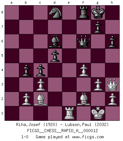 Last move : 1-0 2007 April 8 10:19:55 [Event "FICGS__CHESS__RAPID_A__000012"] [Site "FICGS"] [Date "2007.02.07"] [Round "1"] [White "Riha,Josef"] [Black "Lubson,Paul"] [Result "1-0"] [WhiteElo "1920"] [BlackElo "2032"] 1.e4 e5 2.Nf3 Nc6 3.Bb5 a6 4.Ba4 Nf6 5.O-O Nxe4 6.d4 b5 7.Bb3 d5 8.dxe5 Be6 9.Nbd2 Be7 10.c3 O-O 11.Bc2 f5 12.Nb3 Qd7 13.Nbd4 Nxd4 14.Nxd4 c5 15.Nxe6 Qxe6 16.f3 Ng5 17.a4 Rad8 18.axb5 axb5 19.Ra7 c4 20.Be3 b4 21.Qd2 f4 22.Bf2 Nf7 23.Qxf4 Nxe5 24.Qe3 Qf6 25.f4 Nc6 26.Ra6 Rd6 27.Re1 Nd8 28.Rxd6 Bxd6 29.Qh3 h6 30.g3 1-0 This chess game has been lost on time (started : 2007.02.07 21:3:10) Ruy Lopez : Open, 7.Bb3 Kingside Castling by player White (move 5) Kingside Castling by player Black (move 10) Player White won this chess game. Follow this game move after move (download)Chess is not like life... it has rules ! (Mark Pasternak) Ohne ihre Erfolge schmälern zu wollen würde ich sagen Petrosian, Spassky und Karpov verdanken ihre Siege ihren Trainern - Boleslavsky, Bondarevsky und Furman. (Mikhail Moiseyevich Botvinik) ¿Cual es el objetivo de jugar una apertura de gambito?... Para adquirir una reputación de ser un jugador apuesto a costo de perder el juego. (Siegbert Tarrasch) L'ordinateur a tué l'originalité. Il n'y a plus guère d'aventures sur l'échiquier. (Jacob Murray) The general who wins the battle makes many calculations in his temple before the battle is fought. The general who loses makes but few calculations beforehand. (Sun Tzu)