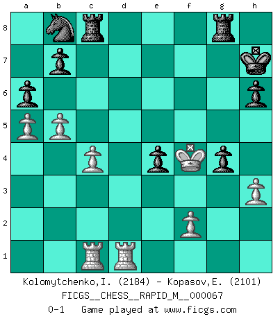 Last move : 0-1 2014 April 10 5:19:41 [Event "FICGS__CHESS__RAPID_M__000067"] [Site "FICGS"] [Date "2013.10.21"] [Round "1"] [White "Kolomytchenko,Igor"] [Black "Kopasov,Evgeny"] [Result "0-1"] [WhiteElo "2184"] [BlackElo "2101"] 1.e4 c5 2.Nf3 d6 3.d4 cxd4 4.Nxd4 Nf6 5.Nc3 a6 6.Be2 e5 7.Nf3 Be7 8.O-O O-O 9.a4 Be6 10.Re1 h6 11.h3 Nbd7 12.Bf1 Rc8 13.a5 Qc7 14.Bd2 Rfd8 15.b4 Bc4 16.Bd3 d5 17.Nxd5 Nxd5 18.exd5 Bxd5 19.Rc1 Qc6 20.Qe2 Bxf3 21.gxf3 Qe6 22.Kg2 f5 23.Kh1 Qf7 24.c4 Qh5 25.Kh2 Nb8 26.b5 Bd6 27.f4 Qxe2 28.Bxe2 e4 29.Red1 g5 30.Kg3 Kh7 31.Be3 gxf4+ 32.Bxf4 Rg8+ 33.Bg4 Bxf4+ 34.Kxf4 fxg4 0-1 Sicilian : Najdorf, Opovcensky variation Kingside Castling by player White (move 8) Kingside Castling by player Black (move 8) Player Black won this chess game. Follow this game move after move (download)Your body has to be in top condition. Your Chess deteriorates as your body does. You can't separate body from mind. (Bobby Fischer) Offener Brief an US-Präsident Bush anlässlich der Verhaftung Bobby Fishers: Verhaften Sie mich. Stecken Sie mich in dieselbe Zelle wie Bobby Fisher und geben Sie uns ein Schachspiel mit. (Boris Vassilievich Spassky) Mis oponentes también hacen buenas movidas. A veces yo no tomo esas cosas en consideración. (Bobby Fischer) Comme les marins qui ont mille raisons différentes d'aller en mer, les joueurs d'échecs en ont tout autant avant de s'installer devant une table et jouer... (Vincent Bertignac, philosophe) The only thing that matters is the evidence. (Horatio Caine, C.S.I. Miami)