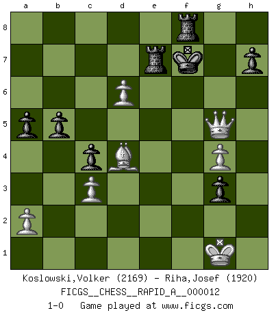 Last move : 1-0 2007 March 23 15:23:54 [Event "FICGS__CHESS__RAPID_A__000012"] [Site "FICGS"] [Date "2007.02.07"] [Round "1"] [White "Koslowski,Volker"] [Black "Riha,Josef"] [Result "1-0"] [WhiteElo "2169"] [BlackElo "1920"] 1.f4 d5 2.Nf3 g6 3.g3 Bg7 4.Bg2 Nf6 5.d3 b6 6.Ne5 Bb7 7.c4 O-O 8.Nc3 Nbd7 9.O-O e6 10.Qa4 Nc5 11.Qa3 dxc4 12.Nxc4 Bxg2 13.Kxg2 Qb8 14.Be3 Ncd7 15.Qb3 Qb7+ 16.Rf3 Nd5 17.Bf2 Nxc3 18.bxc3 c5 19.e4 Qc6 20.Nd2 b5 21.e5 g5 22.Kg1 Rab8 23.Re1 Kh8 24.d4 gxf4 25.Rxf4 Bh6 26.Rh4 Bg5 27.Rh5 Bxd2 28.Qc2 f5 29.Qxd2 Qd5 30.Re2 c4 31.Rh6 a5 32.Rxe6 Qxe6 33.d5 Qg6 34.e6 f4 35.exd7 Qb1+ 36.Re1 Qd3 37.Bd4+ Kg8 38.Qc1 fxg3 39.h3 Qg6 40.Re6 Qh5 41.Re4 Rbd8 42.Rg4+ Qxg4 43.hxg4 Rxd7 44.Qg5+ Kf7 45.Qe5 Re7 46.Qh5+ Kg8 47.Qg5+ Kf7 48.d6 1-0 Bird's Opening Kingside Castling by player Black (move 7) Kingside Castling by player White (move 9) Player White won this chess game. Follow this game move after move (download)You have to have the fighting spirit. You have to force moves and take chances. (Bobby Fischer) Ein Isolani verdüstert die Stimmung auf dem ganzen Schachbrett. (Savielly Grigorievitsch Tartakower) Sin errores no puede haber brillantez. (Emanuel Lasker) Dans le domaine de la peinture, de la gravure et de la sculpture, dès la première décennie de notre siècle, les artistes abandonnent la représentation de la partie d'échecs pour se concentrer sur les pièces, sur les échiquiers et sur toutes les variations auxquelles les unes et les autres peuvent donner lieu. On passe en quelque sorte d'un thème social à un thème musical (au sens de la musica médiévale, c'est-à-dire d'une notion qui inclue le rythme, l'harmonie, la construction et la déconstruction, etc.). Graphiquement et picturalement, l'échiquier apparaît comme une structure ouverte, dynamique, d'une richesse infinie, autorisant toutes les combinatoires et débouchant sur des mouvements et des rythmes de nature exponentielle. (Michel Pastoureau) Establishing goals is all right if you don't let them deprive you of interesting detours. (Doug Larson)