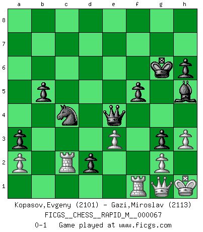 Last move : 0-1 2014 April 2 14:1:50 [Event "FICGS__CHESS__RAPID_M__000067"] [Site "FICGS"] [Date "2013.10.21"] [Round "1"] [White "Kopasov,Evgeny"] [Black "Gazi,Miroslav"] [Result "0-1"] [WhiteElo "2101"] [BlackElo "2113"] 1.d4 Nf6 2.Nf3 e6 3.Bf4 c5 4.c3 d5 5.e3 Nc6 6.Nbd2 Bd6 7.Bg3 O-O 8.Bd3 b6 9.Ne5 Bb7 10.f4 Ne7 11.Qf3 Nf5 12.Bf2 Be7 13.O-O Qc7 14.Rac1 Rad8 15.Rfd1 c4 16.Bb1 Nd6 17.Bh4 Nfe4 18.Bxe7 Qxe7 19.Bxe4 dxe4 20.Qe2 b5 21.Ra1 f6 22.Ng4 Qd7 23.Rdb1 a5 24.b3 Bd5 25.bxc4 Nxc4 26.Nb3 Rc8 27.Nc5 Rxc5 28.dxc5 Qc6 29.Re1 Qxc5 30.Nf2 Rc8 31.Nd1 a4 32.Qf2 f5 33.Re2 h6 34.Kh1 a3 35.Rb1 e5 36.fxe5 Be6 37.Qg3 Rd8 38.h3 Rd3 39.Qf2 g5 40.Rc1 Nxe5 41.Rb1 Kg7 42.Qe1 Nc4 43.Qg1 Bf7 44.Nf2 Rxc3 45.Nd1 Rd3 46.Rc2 Qe5 47.Rbc1 g4 48.Rb1 Bh5 49.Nf2 g3 50.Nxd3 exd3 51.R2c1 d2 52.Rc2 Kg6 53.Rf1 Qe4 0-1 Queen's pawn game Kingside Castling by player Black (move 7) Kingside Castling by player White (move 13) Player Black won this chess game. Follow this game move after move (download)Avoid the crowd. Do your own thinking independently. Be the Chess player, not the Chess piece. (Ralph Charell) Schach ist mein Leben, meine Leidenschaft, was ich gelernt habe und seit meinem 14. Lebensjahr profimässig praktiziere. Darauf zu verzichten, würde mir sehr schwer fallen. (Viktor Kortschnoi) El Ajedrez es una hermosa aventura. (Bent Larsen) D'abord les bases : Jouez et étudiez, puis étudiez et jouez, ensuite jouez et étudiez, puis étudiez et jouez. Deuxièmement : Donnez toujours le meilleur de vous-même ! (Ken Smith) Memory... is the diary that we all carry with us. (Oscar Wilde, The Importance of Being Earnest)