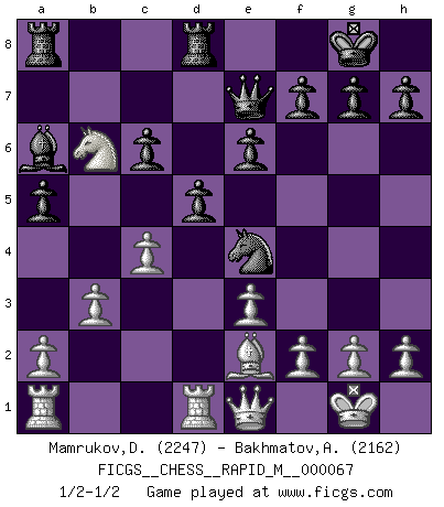 Last move : 1/2-1/2 2013 November 14 10:13:5 [Event "FICGS__CHESS__RAPID_M__000067"] [Site "FICGS"] [Date "2013.10.21"] [Round "1"] [White "Mamrukov,Dmitri"] [Black "Bakhmatov,Andrey"] [Result "1/2-1/2"] [WhiteElo "2247"] [BlackElo "2162"] 1.Nf3 Nf6 2.c4 c5 3.Nc3 Nc6 4.d4 cxd4 5.Nxd4 e6 6.Ndb5 Bb4 7.Bf4 O-O 8.Bc7 Qe7 9.Bd6 Bxd6 10.Qxd6 Qd8 11.e3 a6 12.Nd4 Ne8 13.Nxc6 bxc6 14.Qd2 d5 15.Be2 a5 16.O-O Ba6 17.Rfd1 Nf6 18.Na4 Qe7 19.b3 Rfd8 20.Nb6 Ne4 21.Qe1 1/2-1/2 Reti Opening Kingside Castling by player Black (move 7) Kingside Castling by player White (move 16) This chess game ended in a draw. Follow this game move after move (download)You must take your opponent into a deep dark forest where 2+2=5, and the path leading out is only wide enough for one. (Mikhail Tal) Schach ist das schnellste Spiel der Welt, weil man in jeder Sekunde Tausende von Gedanken ordnen muß. (Albert Einstein) Muchos se han convertido en Maestros de Ajedrez, nadie se ha convertido en el Maestro del Ajedrez. (Siegbert Tarrasch) La vie et les Echecs sont tous les deux une lutte constante. (Lasker) That's absurd. I love it. (Gregory House, House M.D.)