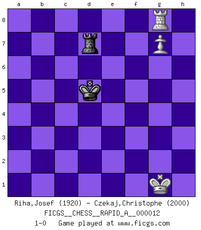 Last move : 1-0 2007 May 18 11:25:16 [Event "FICGS__CHESS__RAPID_A__000012"] [Site "FICGS"] [Date "2007.02.07"] [Round "1"] [White "Riha,Josef"] [Black "Czekaj,Christophe"] [Result "1-0"] [WhiteElo "1920"] [BlackElo "2000"] 1.d4 d5 2.Nf3 Nf6 3.c4 e6 4.Nc3 c6 5.e3 Nbd7 6.Bd3 dxc4 7.Bxc4 b5 8.Bd3 Bd6 9.O-O O-O 10.e4 e5 11.d5 cxd5 12.Nxd5 a6 13.Bg5 h6 14.Bh4 Bb7 15.Nxf6+ Nxf6 16.a4 Qe7 17.Qe2 g5 18.Bg3 Rfd8 19.Rfd1 bxa4 20.Rxa4 Nd7 21.R4a1 Nc5 22.Bc2 Rac8 23.h4 f6 24.Nd2 Ne6 25.Bb3 Kg7 26.Nf3 Bb4 27.Bd5 a5 28.hxg5 hxg5 29.Nxe5 Bxd5 30.exd5 Nf8 31.Qe3 fxe5 32.Bxe5+ Kf7 33.d6 Qe6 34.Qxg5 Qg6 35.Qh4 Bxd6 36.Qf4+ Ke7 37.Rxa5 Bxe5 38.Rxe5+ Ne6 39.Rde1 Rd6 40.Qb4 Kd7 41.f4 Qg4 42.Qe4 R8c6 43.f5 Qxe4 44.fxe6+ Rxe6 45.R5xe4 Rf6 46.Rd4+ Kc7 47.g4 Rc2 48.b4 R6f2 49.Rc1 Rg2+ 50.Kf1 Rgf2+ 51.Ke1 Rh2 52.Rxc2+ Rxc2 53.Kf1 Ra2 54.b5 Kb6 55.g5 Kxb5 56.g6 Kc5 57.Rd8 Ra7 58.Rg8 Kd5 59.g7 Rd7 60.Kg1 1-0 Queen's pawn game Kingside Castling by player White (move 9) Kingside Castling by player Black (move 9) 10 pieces endgame at move 44 : White KRRPPP , Black KQRR WHITE : King + 2 Rooks 3 Pawns BLACK : King + 1 Queen 2 Rooks 9 pieces endgame at move 44 : White KRRPP , Black KQRR WHITE : King + 2 Rooks 2 Pawns BLACK : King + 1 Queen 2 Rooks 8 pieces endgame at move 45 : White KRRPP , Black KRR WHITE : King + 2 Rooks 2 Pawns BLACK : King + 2 Rooks 7 pieces endgame at move 52 : White KRRPP , Black KR WHITE : King + 2 Rooks 2 Pawns BLACK : King + 1 Rook 6 pieces endgame at move 52 : White KRPP , Black KR WHITE : King + 1 Rook 2 Pawns BLACK : King + 1 Rook 5 pieces endgame at move 55 : White KRP , Black KR WHITE : King + 1 Rook 1 Pawn BLACK : King + 1 Rook Player White won this chess game. Follow this game move after move (download)I believe that Chess possesses a magic that is also a help in advanced age. A rheumatic knee is forgotten during a game of Chess and other events can seem quite unimportant in comparison with a catastrophe on the chessboard. (Vlastimil Hort) Sie bekommen vielleicht den Eindruck, dass die Spitzenspieler überhaupt gar nicht so stark sind. Aber das stimmt nicht. Es ist eine Illusion. Mit einem Computer an der Seite ist es sehr leicht, Urteile zu fällen, aber wenn man alleine am Brett sitzt, sieht die Sache ganz anders aus. (Vladimir Kramnik) El Ajedrez es despiadado: debes de estar preparado para matar gente. (Nigel Short) Vouloir jouer aux échecs contre soi-même est aussi paradoxal que vouloir marcher sur son ombre. (Stefan Zweig) SEO proverb : Make your website optimized for human beings, not for search engines.