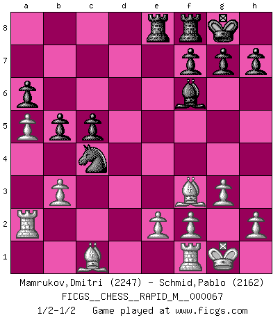 Last move : 1/2-1/2 2013 December 29 14:15:19 [Event "FICGS__CHESS__RAPID_M__000067"] [Site "FICGS"] [Date "2013.10.21"] [Round "1"] [White "Mamrukov,Dmitri"] [Black "Schmid,Pablo"] [Result "1/2-1/2"] [WhiteElo "2247"] [BlackElo "2162"] 1.Nf3 d5 2.d4 e6 3.c4 c6 4.Qc2 Nf6 5.g3 dxc4 6.Qxc4 b5 7.Qd3 Bb7 8.Bg2 Nbd7 9.O-O a6 10.Nfd2 Qb6 11.a4 Be7 12.Nc3 O-O 13.Nb3 Rfd8 14.Qf3 Rdb8 15.a5 Qd8 16.Qe3 Qf8 17.Ne4 e5 18.Nxf6+ Bxf6 19.dxe5 Nxe5 20.Qc5 Nc4 21.Qxf8+ Rxf8 22.Nc5 Bc8 23.Ra2 Bf5 24.Ne4 Bxe4 25.Bxe4 Rae8 26.Bf3 c5 27.b3 1/2-1/2 Reti Opening Kingside Castling by player White (move 9) Kingside Castling by player Black (move 12) This chess game ended in a draw. Follow this game move after move (download)Do you realize Fischer almost never has any bad pieces? He exchanges them, and the bad pieces remain with his opponents. (Yuri Balashov) Obwohl ich alt bin, darf mir niemand den Finger in den Mund stecken, sonst beisse ich. (Wilhelm Steinitz) Nunca antes ha habido un jugador de Ajedrez con tal conocimiento a fondo de las complejidades del juego y una inmensa voluntad absolutamente indomable de ganar. Yo pienso que Fischer es el jugador mas grande que jamás haya existido. (Lisa Lane) Lorsque vous vous retrouvez devant une position atroce, ne tendez pas un ultime piège dérisoire avec l'intention d'abandonner si l'adversaire le déjoue ! Faites-vous plutôt un devoir de résister comme si votre vie en dépendait. Jouez le coup qui vous déplairait au centuple si vous étiez dans la peau de votre tortionnaire ! Luck never made a man wise. (Seneca, Letters to Lucilius)