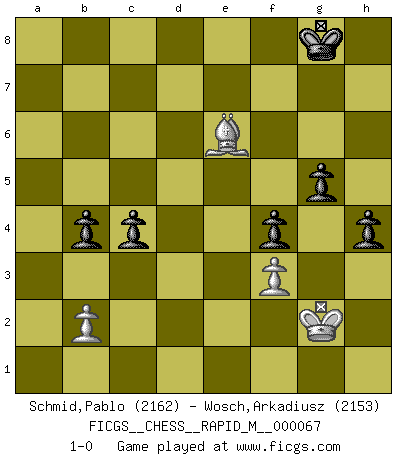 Last move : 1-0 2014 January 9 9:15:52 [Event "FICGS__CHESS__RAPID_M__000067"] [Site "FICGS"] [Date "2013.10.21"] [Round "1"] [White "Schmid,Pablo"] [Black "Wosch,Arkadiusz"] [Result "1-0"] [WhiteElo "2162"] [BlackElo "2153"] 1.d4 Nf6 2.c4 e6 3.Nf3 d5 4.Nc3 c6 5.Bg5 h6 6.Bh4 dxc4 7.e4 g5 8.Bg3 b5 9.Be2 Bb7 10.O-O Nbd7 11.Ne5 Bg7 12.Nxd7 Nxd7 13.Bd6 a6 14.a4 e5 15.Bg4 exd4 16.e5 c5 17.Re1 Nxe5 18.Bxe5 O-O 19.Bxg7 Kxg7 20.Ne2 f5 21.Bh5 f4 22.Nxd4 cxd4 23.Re6 Rf6 24.Qe1 Bd5 25.Re7+ Kg8 26.axb5 Qd6 27.h3 axb5 28.Rxa8+ Bxa8 29.Re8+ Rf8 30.Re6 Qd5 31.f3 d3 32.Rg6+ Kh7 33.Qe7+ Rf7 34.Qe8 Qc5+ 35.Kh2 Qf8 36.Qe5 Bxf3 37.gxf3 Re7 38.Re6 Rxe6 39.Qxe6 Kh8 40.Kg2 d2 41.Qd5 d1Q 42.Qxd1 Qf5 43.Qd8+ Kg7 44.Qe7+ Kg8 45.h4 gxh4 46.Bg4 Qg5 47.Qxg5+ hxg5 48.Bd7 b4 49.Be6+ 1-0 Queen's pawn game Kingside Castling by player White (move 10) Kingside Castling by player Black (move 18) Promotion Queen by player Black (move 41) 10 pieces endgame at move 47 : White KBPP , Black KPPPPP WHITE : King + 1 Bishop 2 Pawns BLACK : King + 5 Pawns Player White won this chess game. Follow this game move after move (download)In Chess, as it is played by masters, chance is practically eliminated. (Emanuel Lasker) Mein Gehirn das ist mein zweitwichtigstes Organ [Aus dem Film: Der Schläfer]. (Woody Allen) La maestría del Ajedrez consiste esencialmente en analizar posiciónes de Ajedrez con precisión. (Mikhail Botvinnik) Le succès, c'est être capable d'aller d'échec en échec sans perdre son enthousiasme. (Winston Churchill) When you have everything, sometimes it feels like nothing. (Horatio Caine, C.S.I. Miami)