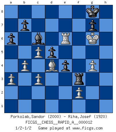 Last move : 1/2-1/2 2007 May 6 10:33:50 [Event "FICGS__CHESS__RAPID_A__000012"] [Site "FICGS"] [Date "2007.02.07"] [Round "1"] [White "Porkolab,Sandor"] [Black "Riha,Josef"] [Result "1/2-1/2"] [WhiteElo "2000"] [BlackElo "1920"] 1.e4 c5 2.c3 e6 3.d4 d5 4.e5 Nc6 5.Nf3 Bd7 6.Be2 Nge7 7.O-O Rc8 8.dxc5 Ng6 9.b4 Be7 10.Na3 a6 11.Re1 O-O 12.Bd3 f6 13.exf6 Bxf6 14.Bxg6 hxg6 15.Qb3 Qc7 16.Be3 Ne5 17.Nxe5 Qxe5 18.Rac1 Qh5 19.Bd4 Bg5 20.Rcd1 Bf4 21.g3 Bc7 22.Rd2 Rf7 23.Qd1 Rf3 24.Nc2 Re8 25.Re3 Ref8 26.Rxf3 Rxf3 27.Ne3 Bc6 28.h4 g5 29.hxg5 e5 30.Kg2 e4 31.Qh1 Qxg5 32.Qh3 Bf4 33.Rd1 Bxe3 34.Bxe3 Qg6 35.Rh1 Kf7 36.Qc8 Qe6 37.Qxe6+ Kxe6 38.Rh7 Rf7 39.g4 Kf6 40.Kg3 Kg6 41.Rh5 Rf3+ 42.Kh4 Rf7 43.Rg5+ Kh7 44.Re5 Rf8 45.Re7 Kg6 46.Bd4 Rf7 47.Re6+ Kh7 48.a3 Kg8 49.Kg5 Rf3 50.Kg6 Rf4 51.Kh5 Rf3 52.Kg6 1/2-1/2 Sicilian : Alapin's variation (2.c3) Kingside Castling by player White (move 7) Kingside Castling by player Black (move 11) This chess game ended in a draw. Follow this game move after move (download)All my games are real. (Bobby Fischer) Heutzutage gewinnt im Turnier nicht derjenige Spieler, der weitreichende Pläne entwirft, sondern einfach jener, der Zug um Zug kämpft. (David Bronstein) Yo no le temo a Spassky. Todos saben que yo soy el mejor. Uno no necesita un torneo para probarlo. (Bobby Fischer) J'ai toujours senti une vague pitié pour l'homme qui ne connaît rien aux échecs, tout comme j'en aurais pour un homme ignorant de l'amour. Les Echecs, comme la musique ou comme l'amour, ont le pouvoir de rendre heureux. (Siegbert Tarrasch) Memory... is the diary that we all carry with us. (Oscar Wilde, The Importance of Being Earnest)