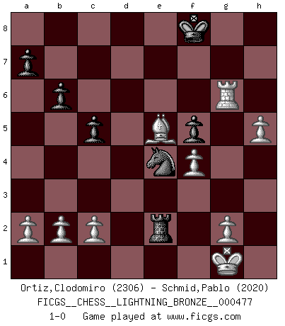 Last move : 1-0 2013 October 22 23:22:25 [Event "FICGS__CHESS__LIGHTNING_BRONZE__000477"] [Site "FICGS"] [Date "2013.10.22"] [Round "1"] [White "Ortiz,Clodomiro"] [Black "Schmid,Pablo"] [Result "1-0"] [WhiteElo "2306"] [BlackElo "2020"] 1.f4 g6 2.Nf3 Bg7 3.e4 d6 4.d4 Nf6 5.Nc3 c5 6.Bb5+ Bd7 7.Bxd7+ Qxd7 8.dxc5 dxc5 9.Qe2 Nc6 10.O-O O-O 11.Rd1 Qc8 12.e5 Ng4 13.h3 Nh6 14.Be3 b6 15.Rd2 f6 16.exf6 exf6 17.Qb5 Nf7 18.Rad1 f5 19.Nd5 Kh8 20.Qb3 Na5 21.Qd3 Re8 22.Bf2 Nd6 23.Ne7 Rxe7 24.Qxd6 Qe8 25.Bh4 Re6 26.Qc7 Rc6 27.Qd7 Nc4 28.Re1 Qxd7 29.Rxd7 Rd6 30.Rb7 Nd2 31.Ng5 Kg8 32.R1e7 Bf6 33.Rec7 Nc4 34.Nf7 Na5 35.Nxd6 Nxb7 36.Bxf6 Nxd6 37.Rg7+ Kf8 38.Rxh7 Nf7 39.Rg7 Re8 40.Rxg6 Re2 41.h4 Nd6 42.h5 Ne4 43.Be5 1-0 Bird's Opening Kingside Castling by player White (move 10) Kingside Castling by player Black (move 10) Player White won this chess game. Follow this game move after move (download)The chessboard is the world, the pieces are the phenomena of the Universe, the rules of the game are what we call the laws of Nature and the player on the other side is hidden from us. (Thomas Huxley) Ich kenne keine einzige Person, die behaupten würde, Garri Kasparow sei ein guter Mensch (Nigel Short) Un Peón pasado aumenta su poder a medida de que el número de piezas en el tablero disminuye. (Capablanca) Vous n'êtes pas toujours obligé de jouer le meilleur coup. Un coup doit être actif, entreprenant, correct et beau ! (David Bronstein) Life is the sum of all your choices. (Albert Camus)