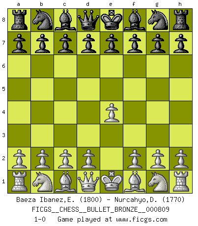 Last move : 1-0 2013 October 24 5:31:10 [Event "FICGS__CHESS__BULLET_BRONZE__000809"] [Site "FICGS"] [Date "2013.10.23"] [Round "1"] [White "Baeza Ibanez,Eduardo Alex"] [Black "Nurcahyo,Dery"] [Result "1-0"] [WhiteElo "1800"] [BlackElo "1770"] 1.e4 1-0 This chess game has been lost on time (started : 2013.10.23 17:28:9) King's pawn Opening Player White won this chess game. Follow this game move after move (download)I won't play with you anymore. You have insulted my friend. - When an opponent cursed himself for a blunder. (Miguel Najdorf) Nach Morphy wurde nichts neues mehr in der Behandlung offener Positionen gefunden. (Mikhail Moiseyevich Botvinik) Debes de llevar a tu oponente hacia un profundo y obscuro bosque donde 2+2=5, y el camino que conduce a la salida es suficientemente ancho para solamente uno. (Mikhail Tal) Le moment que je préfère le plus dans une rencontre, c'est celui où je sens que la personnalité de l'adversaire se brise. (Robert Fischer) Just because you do not take an interest in politics doesn't mean politics won't take an interest in you. (Pericles 430 B.C.)