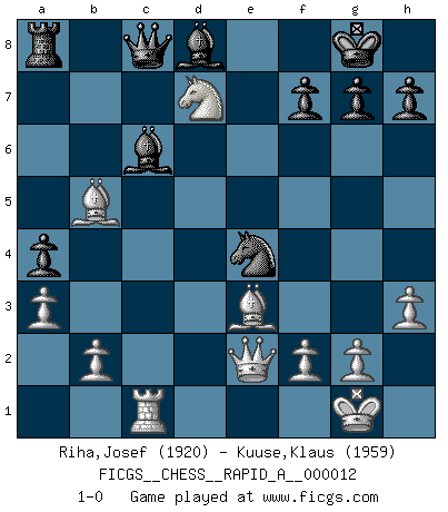 Last move : 1-0 2007 February 10 19:51:30 [Event "FICGS__CHESS__RAPID_A__000012"] [Site "FICGS"] [Date "2007.02.07"] [Round "1"] [White "Riha,Josef"] [Black "Kuuse,Klaus"] [Result "1-0"] [WhiteElo "1920"] [BlackElo "1959"] 1.e4 e5 2.Nf3 Nc6 3.Bb5 a6 4.Ba4 Nf6 5.O-O Be7 6.Re1 b5 7.Bb3 d6 8.c3 O-O 9.h3 Na5 10.Bc2 c5 11.d4 Qc7 12.Nbd2 cxd4 13.cxd4 Nc6 14.Nb3 a5 15.Be3 a4 16.Nbd2 Be6 17.a3 Na5 18.Bd3 Qb7 19.dxe5 dxe5 20.Nxe5 Nb3 21.Nxb3 Bxb3 22.Qe2 Nxe4 23.Bxb5 Bd5 24.Rac1 Rfc8 25.Rxc8+ Qxc8 26.Nd7 Bd8 27.Rd1 Bc6 28.Rc1 1-0 Ruy Lopez : Closed Kingside Castling by player White (move 5) Kingside Castling by player Black (move 8) Player White won this chess game. Follow this game move after move (download)Good positions don't win games, good moves do. (Gerald Abrahams) Im Wettkampf zwischen starken Meistern kommen Fehler sehr selten vor, deshalb ist es mit bloßem Warten nicht getan. (José Raúl Capablanca) Tu sabes, camarada Pachman, no disfruto el ser un Ministro, preferería jugar al Ajedrez como tu. (Che Guevara) À la honte des hommes, on sait que les lois du jeu sont les seules qui soient partout justes, claires, inviolables et exécutées. Pourquoi l'Indien qui a donné les règles du jeu d'échecs est-il obéi de bon gré dans toute la terre, et que les décrétales des papes, par exemple, sont aujourd'hui un objet d'horreur et de mépris ? C'est que l'inventeur des échecs combina tout avec justesse pour la satisfaction des joueurs, et que les papes, dans leurs décrétales, n'eurent en vue que leur seul avantage. L'Indien voulut exercer également l'esprit des hommes et leur donner du plaisir; les papes ont voulu abrutir l'esprit des hommes. Voltaire (Dictionnaire philosophique / Garnier 1967) Drag your thoughts away from your troubles... by the ears, by the heels, or any other way you can manage it. (Mark Twain)