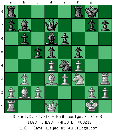 Last move : 1-0 2014 January 14 11:12:59 [Event "FICGS__CHESS__RAPID_B__000212"] [Site "FICGS"] [Date "2013.10.24"] [Round "1"] [White "Dikant,Christophe"] [Black "Gadhesariya,Divyesh"] [Result "1-0"] [WhiteElo "1704"] [BlackElo "1703"] 1.d4 Nf6 2.Nf3 e6 3.e3 d5 4.Bd3 c5 5.b3 b6 6.Bb2 Nbd7 7.Nbd2 Bb7 8.O-O Bd6 9.Ne5 O-O 10.f4 Ne4 11.Rf3 f6 12.Nxd7 Qxd7 13.Rh3 f5 14.Nf3 1-0 This chess game has been lost on time (started : 2013.10.24 1:21:2) Queen's pawn : Yusupov-Rubinstein system Kingside Castling by player White (move 8) Kingside Castling by player Black (move 9) Player White won this chess game. Follow this game move after move (download)When you play Bobby, it is not a question if you win or lose. It is a question if you survive. (Boris Spassky) Mutter, ich bin eben Ex-Weltmeister geworden. --beim nach Hause Kommen nach dem Verlust des WM-Titels an Mihail Botvinnik -- (Mikhail Nekhemyevich Tal) No puedes jugar al Ajedrez si eres de corazón noble. (Proverbio Francés) Un footballeur joue avec ses pieds, parfois avec sa tête. Un joueur d'échecs ne joue qu'avec sa tête. Et quand il ne joue plus, il meurt. (Jacob Murray) A bird doesn't sing because it has an answer, it sings because it has a song. (Maya Angelou)