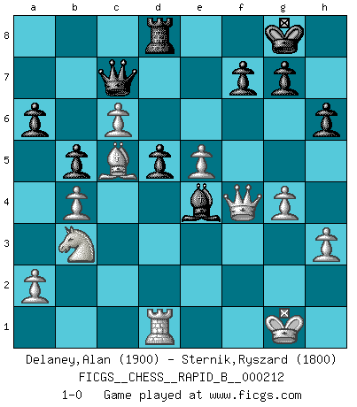 Last move : 1-0 2014 January 18 22:26:12 [Event "FICGS__CHESS__RAPID_B__000212"] [Site "FICGS"] [Date "2013.10.24"] [Round "1"] [White "Delaney,Alan"] [Black "Sternik,Ryszard"] [Result "1-0"] [WhiteElo "1900"] [BlackElo "1800"] 1.Nf3 d5 2.d4 Nf6 3.c4 c6 4.g3 dxc4 5.Bg2 Bf5 6.O-O e6 7.Nbd2 Be7 8.Nxc4 Nbd7 9.Bf4 Nb6 10.Na5 Qc8 11.Ne5 Nbd5 12.Bc1 Qc7 13.Nac4 Rd8 14.Re1 Nb6 15.e4 Nxc4 16.Nxc4 Bg4 17.f3 Bh5 18.Bf4 Qc8 19.Rc1 O-O 20.Be3 c5 21.g4 Bg6 22.Nd2 Qb8 23.dxc5 b6 24.c6 Bd6 25.h3 Bg3 26.Qe2 Qc7 27.Red1 Be5 28.b4 Bb2 29.Rc4 b5 30.Rc5 a6 31.f4 h6 32.e5 Nd5 33.Bxd5 Rxd5 34.Rxd5 exd5 35.Nb3 Bc3 36.Bc5 Rd8 37.Qf3 Bxe5 38.fxe5 Be4 39.Qf4 1-0 Reti Opening Kingside Castling by player White (move 6) Kingside Castling by player Black (move 19) Player White won this chess game. Follow this game move after move (download)Chess, like love, is infectious at any age. (Flohr) Mein erstes Ziel war nicht, die Partie zu gewinnen, sondern eine Figur zu opfern. -- der junge (Wilhelm Steinitz) Bobby Fischer es el jugador de Ajedrez mas grande que jamás haya existido. (Ken Smith) La vérité est comme le meilleur coup aux échecs : elle existe, mais il faut la chercher. (Arturo Perez-Reverte) Life is pain my dear and anyone who says otherwise is selling something. (Princess Bride)