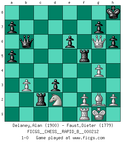 Last move : 1-0 2014 January 25 11:38:30 [Event "FICGS__CHESS__RAPID_B__000212"] [Site "FICGS"] [Date "2013.10.24"] [Round "1"] [White "Delaney,Alan"] [Black "Faust,Dieter"] [Result "1-0"] [WhiteElo "1900"] [BlackElo "1779"] 1.Nf3 Nf6 2.d4 e6 3.c4 b6 4.g3 Ba6 5.b3 Bb4+ 6.Bd2 Be7 7.Bg2 O-O 8.O-O d5 9.cxd5 Nxd5 10.Nc3 Nc6 11.Re1 Bf6 12.e4 Ndb4 13.e5 Be7 14.Be3 f6 15.exf6 Bxf6 16.Ne4 Nd3 17.Re2 Bxd4 18.Nxd4 Nxd4 19.Rd2 Rc8 20.a4 c5 21.a5 bxa5 22.Bxd4 cxd4 23.Rxd3 Bxd3 24.Qxd3 h6 25.Bh3 Qb6 26.Nd2 Rc3 27.Qg6 Kh8 28.Bf1 Rf5 29.Bg2 d3 30.Rf1 Rc2 31.g4 1-0 Reti Opening Kingside Castling by player Black (move 7) Kingside Castling by player White (move 8) Player White won this chess game. Follow this game move after move (download)Good positions don't win games, good moves do. (Gerald Abrahams) Wie ich sie so einen nach dem anderen nieder mähte wurde meine Überlegenheit offensichtlich. (José Raúl Capablanca) El Ajedrez es una hermosa aventura. (Bent Larsen) En blitz, le Cavalier l'emporte sur le Fou. (Vlastimil Hort) Think like a man of action, act like a man of thought. (Henri Louis Bergson)