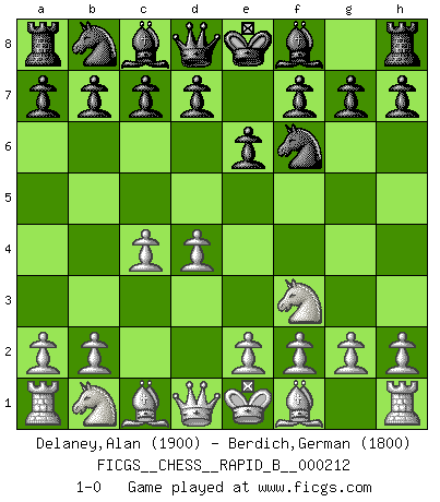Last move : 1-0 2013 November 29 8:9:12 [Event "FICGS__CHESS__RAPID_B__000212"] [Site "FICGS"] [Date "2013.10.24"] [Round "1"] [White "Delaney,Alan"] [Black "Berdich,German"] [Result "1-0"] [WhiteElo "1900"] [BlackElo "1800"] 1.Nf3 Nf6 2.d4 e6 3.c4 1-0 This chess game has been lost on time (started : 2013.10.24 1:21:2) Reti Opening Player White won this chess game. Follow this game move after move (download)Though most people love to look at the games of the great attacking masters, some of the most successful players in history have been the quiet positional players. They slowly grind you down by taking away your space, tying up your pieces, and leaving you with virtually nothing to do ! (Yasser Seirawan) Kein Schachspieler kann gut schlafen. (H. G. Wells) El Ajedrez es en su esencia, un juego. En su forma, un arte. Y en su ejecución, una ciencia. (Baron Tassilo) Les échecs sont un jeu terrible. Si vous n'avez pas le centre, votre adversaire a une position plus libre. Par contre, si vous avez le centre, alors vous avez vraiment quelque chose pour laquelle vous inquiéter ! (Siegbert Tarrasch) You think that education is too expensive ? Try ignorance. (Derek Bok)