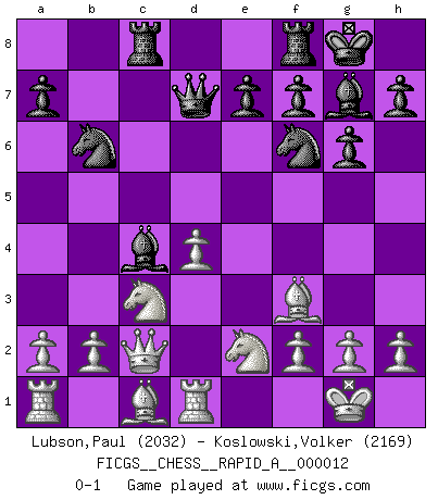 Last move : 0-1 2007 April 7 16:14:4 [Event "FICGS__CHESS__RAPID_A__000012"] [Site "FICGS"] [Date "2007.02.07"] [Round "1"] [White "Lubson,Paul"] [Black "Koslowski,Volker"] [Result "0-1"] [WhiteElo "2032"] [BlackElo "2169"] 1.e4 g6 2.d4 c6 3.c4 d5 4.exd5 cxd5 5.Nc3 Nf6 6.Qb3 Bg7 7.cxd5 O-O 8.Be2 Nbd7 9.Bf3 Nb6 10.Nge2 Bf5 11.O-O Bd3 12.d6 Qxd6 13.Bxb7 Bc4 14.Qc2 Rad8 15.Rd1 Qd7 16.Bf3 Rc8 0-1 This chess game has been lost on time (started : 2007.02.07 21:3:10) Robatsch (Modern) defense Kingside Castling by player Black (move 7) Kingside Castling by player White (move 11) Player Black won this chess game. Follow this game move after move (download)Combinations have always been the most intriguing aspect of Chess. The masters look for them, the public applauds them, the critics praise them. It is because combinations are possible that Chess is more than a lifeless mathematical exercise. They are the poetry of the game; they are to Chess what melody is to music. They represent the triumph of mind over matter. (Reuben Fine) Fischer machte Schach einfach zu einer aufregenden Sache, wann immer er sich ans Brett setzte. (Raymond Keene) Todos los Maestros de Ajedrez fueron un día unos principiantes. (Chernev) Les sacrifices démontrent seulement que quelqu'un a gaffé. (Savielly Tartacover) You can only get smarter by playing a smarter opponent. (Revolver, movie)