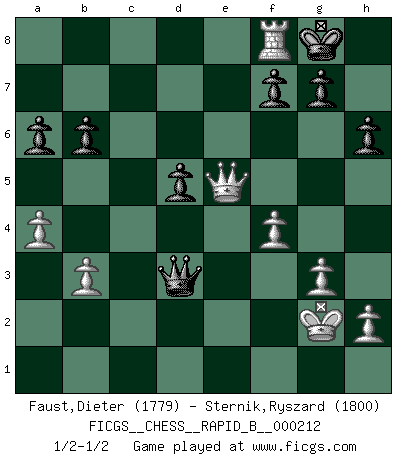 Last move : 1/2-1/2 2013 December 31 22:37:30 [Event "FICGS__CHESS__RAPID_B__000212"] [Site "FICGS"] [Date "2013.10.24"] [Round "1"] [White "Faust,Dieter"] [Black "Sternik,Ryszard"] [Result "1/2-1/2"] [WhiteElo "1779"] [BlackElo "1800"] 1.d4 d5 2.c4 c6 3.Nf3 e6 4.Nc3 dxc4 5.a4 Bb4 6.e3 Qa5 7.Ne5 Nf6 8.Nxc4 Qd8 9.Bd2 O-O 10.Be2 Qe7 11.O-O c5 12.Nb5 Bxd2 13.Qxd2 Rd8 14.f4 Nc6 15.Ne5 a6 16.Na3 cxd4 17.Rfd1 Bd7 18.exd4 Be8 19.Nxc6 Bxc6 20.Nc4 Nd5 21.b3 Qf6 22.g3 Ne7 23.Nb6 Rab8 24.Qe3 Qf5 25.Bf3 Qc2 26.d5 Nxd5 27.Nxd5 Bxd5 28.Bxd5 Rxd5 29.Rxd5 exd5 30.Rc1 Qg6 31.Qe5 Rd8 32.Qc7 Qf6 33.Re1 b6 34.Re7 Qd4+ 35.Kg2 Rf8 36.Qe5 Qd3 37.Re8 h6 38.Rxf8+ 1/2-1/2 QGD Slav : 3.Nf3 Kingside Castling by player Black (move 9) Kingside Castling by player White (move 11) This chess game ended in a draw. Follow this game move after move (download)Openings teach you openings. Endgames teach you chess ! (Stephan Gerzadowicz) Ich hatte Zahnschmerzen im ersten Spiel. In der zweiten Partie tat mir der Kopf weh. In der dritten war es eine Rheuma-Attacke und während der vierten fühlte ich mich nicht gut. Und in der fünften? Nun, man muss doch nicht jedes Spiel gewinnen, oder? (Savielly Grigorievitsch Tartakower) Las combinaciones han sido siempre el aspecto más intrigante del Ajedrez. Los Maestros las buscan, el público las aplauden, los críticos las alaban. La razón se debe a que las combinaciones hacen posible que el Ajedrez sea más que un ejercicio matemático con una carencia de vida. Ellas son la poesía del juego, son del Ajedrez lo que la melodía es de la música. Ellas representan el triunfo de la mente sobre la materia. (Reuben Fine) Mon pion favori sur ma case favorite ! Bronstein en parlant d'un coup de pion en h5 quand il avait les Noirs. The Internet is so big, so powerful and pointless that for some people it is a complete substitute for life. (Andrew Brown)