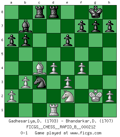 Last move : 0-1 2013 December 13 18:39:22 [Event "FICGS__CHESS__RAPID_B__000212"] [Site "FICGS"] [Date "2013.10.24"] [Round "1"] [White "Gadhesariya,Divyesh"] [Black "Bhandarkar,Dinesh"] [Result "0-1"] [WhiteElo "1703"] [BlackElo "1707"] 1.d4 Nf6 2.c4 c5 3.Nf3 e6 4.Bg5 Be7 5.Nc3 cxd4 6.Nxd4 Nc6 7.e3 Qa5 8.Bd3 Qxg5 9.O-O Nxd4 10.exd4 O-O 11.Ne2 d5 12.Ng3 dxc4 13.Bxc4 b6 14.Qf3 Rb8 15.Qe3 Qxe3 16.fxe3 Bb7 17.b3 Rfd8 18.Rad1 Rbc8 19.Ne2 Ne4 20.Rf4 Bg5 21.g3 Bxf4 22.gxf4 a6 23.Kg2 Nc3 0-1 Benoni defense Kingside Castling by player White (move 9) Kingside Castling by player Black (move 10) Player Black won this chess game. Follow this game move after move (download)Chess is a fairy tale of 1001 blunders. (Savielly Tartakower) Wenn ich gewinne bin ich ein Genie. Wenn nicht, dann bin ich keines. (Robert James Fischer) La enorme capacidad mental, en la que sin ella no puede un jugador de Ajedrez existir, es demasiado requerida por el Ajedrez al grado de que nunca podrá liberar su mente de este juego. (Albert Einstein) Le thème de l'attaque double intervient d'une manière ou d'une autre dans l'immense majorité des combinaisons. (Youri Averbakh) The mind is like a parachute, it only functions when its open. (Unknown)