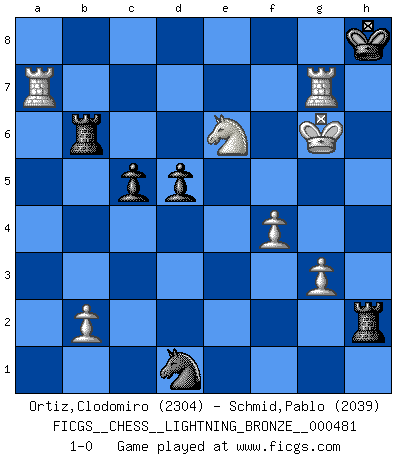 Last move : 1-0 2013 October 24 23:27:29 [Event "FICGS__CHESS__LIGHTNING_BRONZE__000481"] [Site "FICGS"] [Date "2013.10.24"] [Round "1"] [White "Ortiz,Clodomiro"] [Black "Schmid,Pablo"] [Result "1-0"] [WhiteElo "2304"] [BlackElo "2039"] 1.d4 d5 2.Nf3 e6 3.c4 c6 4.Qc2 dxc4 5.Qxc4 Nf6 6.Bg5 b5 7.Qc2 Bb7 8.e3 Nbd7 9.Nbd2 a6 10.a4 Rc8 11.Be2 c5 12.d5 exd5 13.axb5 axb5 14.Bxb5 Be7 15.Ra7 Qb6 16.Qa4 Bc6 17.Bxc6 Qxc6 18.Qxc6 Rxc6 19.O-O Bd8 20.Bxf6 Nxf6 21.Ne5 Rc7 22.Rfa1 O-O 23.R1a6 Re8 24.Nc6 Kf8 25.Nf3 Rc8 26.Kf1 Re6 27.Nfe5 Bc7 28.Nxf7 Ne4 29.f3 Nd2+ 30.Kf2 Nc4 31.Ng5 R6e8 32.Nxh7+ Kg8 33.Ng5 Nxe3 34.g3 Nd1+ 35.Kg1 Re1+ 36.Kg2 R1e8 37.Rb7 Bd6 38.f4 Re2+ 39.Kf3 Rce8 40.Nd8 R2e3+ 41.Kg4 Be7 42.Nde6 Bxg5 43.Nxg5 Re2 44.R6a7 Rxh2 45.Rxg7+ Kh8 46.Kf5 Rb8 47.Kg6 Rb6+ 48.Ne6 1-0 Queen's pawn game Kingside Castling by player White (move 19) Kingside Castling by player Black (move 22) Player White won this chess game. Follow this game move after move (download)There is no remorse like the remorse of Chess. (H. G. Wells) Spielt Blackmar-Diemer-Gambit, und das Matt kommt von selbst! (Emil Joseph Diemer) El ganar no lo es todo... pero el perder es nada. (Mednis) Il n'y a pas de prix trop élevé au scalp de l'ennemi. (Koblentz) I take risks, sometimes patients die, but not taking risks causes more patients to die. So I guess my biggest problem is I've been cursed with the ability to do the math. (Gregory House, House M.D.)