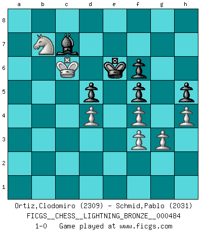 Last move : 1-0 2013 October 25 21:3:23 [Event "FICGS__CHESS__LIGHTNING_BRONZE__000484"] [Site "FICGS"] [Date "2013.10.25"] [Round "1"] [White "Ortiz,Clodomiro"] [Black "Schmid,Pablo"] [Result "1-0"] [WhiteElo "2309"] [BlackElo "2031"] 1.Nf3 d5 2.b4 Bg4 3.Nc3 Nf6 4.h3 Bxf3 5.exf3 e6 6.Rb1 Bd6 7.d4 O-O 8.Nb5 Be7 9.Nc3 c6 10.Qd2 b5 11.Bd3 a5 12.a3 Nbd7 13.O-O axb4 14.axb4 Nb6 15.Rd1 Bd6 16.Qe1 Qe7 17.Ne2 Ra4 18.c3 Rfa8 19.Bg5 h6 20.Bh4 Nc4 21.f4 Qd8 22.Bxc4 bxc4 23.Ra1 Qc7 24.Rxa4 Rxa4 25.Bxf6 gxf6 26.Qd2 f5 27.Rb1 Qa7 28.Nc1 Ra3 29.g3 Qa4 30.Kg2 h5 31.h4 Kg7 32.Rb2 Ra1 33.Ra2 Rxa2 34.Nxa2 Kf6 35.Nc1 Qa3 36.Ne2 Qa1 37.Ng1 Kg6 38.Nf3 Qb1 39.Qe2 Qc1 40.Qe1 Qb2 41.Ng5 Kf6 42.Qe3 Qc2 43.Kg1 Qb1+ 44.Kh2 Qc2 45.Qe1 Kg6 46.Kg2 Be7 47.Nf3 Bf6 48.Qe3 Kh6 49.Qd2 Qe4 50.Qd1 Kg6 51.Kg1 Kg7 52.Ne1 Kg6 53.Ng2 Bd8 54.f3 Qd3 55.Qxd3 cxd3 56.Kf2 Bc7 57.Ke3 f6 58.Kxd3 Kf7 59.Ne3 Ke7 60.Ke2 Bd6 61.Ng2 Kd7 62.Ne1 e5 63.Nd3 exd4 64.cxd4 Ke6 65.Nc5+ Ke7 66.Kd3 Bc7 67.Kc3 Bb6 68.Kb3 Kd6 69.Ka4 Ke7 70.b5 cxb5+ 71.Kxb5 Bc7 72.Nb7 Ke6 73.Kc6 1-0 This chess game has been lost on time (started : 2013.10.25 16:30:25) Santasiere's folly Kingside Castling by player Black (move 7) Kingside Castling by player White (move 13) Player White won this chess game. Follow this game move after move (download)The game of Chess is not merely an idle amusement; several very valuable qualities of the mind are to be acquired and strengthened by it, so as to become habits ready on all occasions; for life is a kind of Chess. (Benjamin Franklin) Das ganze Leben mit einer Ehefrau ist wie ein Endspiel mit ungleichfarbigen Läufern. (Viktor Kortschnoi) Botvinnik trató de alejar el misterio referente al Ajedrez, siempre relacionandolo a situaciones de la vida diaria. Solía llamar al Ajedrez un problema inexacto típico, similar a aquellos en que la gente tiene siempre que resolver a cada día. (Garry Kasparov) Il (Jacob Murray) ne joue pas pour le bon coup, mais pour le meilleur. (Eloi Relange) To be champion requires more than simply being a strong player; one has to be a strong human being as well. (Anatoly Karpov)
