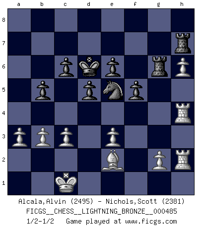 Last move : 1/2-1/2 2013 October 25 18:48:0 [Event "FICGS__CHESS__LIGHTNING_BRONZE__000485"] [Site "FICGS"] [Date "2013.10.25"] [Round "1"] [White "Alcala,Alvin"] [Black "Nichols,Scott"] [Result "1/2-1/2"] [WhiteElo "2495"] [BlackElo "2381"] 1.e4 c6 2.Nf3 d5 3.Nc3 Nf6 4.e5 Ne4 5.Be2 Nxc3 6.dxc3 Bg4 7.Qd4 Bxf3 8.Bxf3 e6 9.Bd2 Nd7 10.O-O-O a5 11.h4 a4 12.a3 Qc7 13.Rhe1 Bc5 14.Qg4 Nb6 15.Qxg7 O-O-O 16.Be3 Bxe3+ 17.fxe3 Nc4 18.Rd4 Kb8 19.Kb1 Rhg8 20.Qxh7 f5 21.Qxc7+ Kxc7 22.h5 b5 23.Rh4 Nxe5 24.Kc1 Ra8 25.Reh1 Kd6 26.h6 Ra7 27.R1h2 Rh7 28.b3 axb3 29.cxb3 Rg6 30.Be2 1/2-1/2 Caro-Kann defense Queenside Castling by player White (move 10) Queenside Castling by player Black (move 15) This chess game ended in a draw. Follow this game move after move (download)A sacrifice is best refuted by accepting it. (Wilhelm Steinitz) Schach ist gnadenlos. Du mußt bereit sein zu töten. (Nigel Short) No hay precio que no valga la pena por la cabellera del Rey enemigo. (Koblentz) Même si l'adversaire joue le coup analysé précédemment, recommencez l'analyse en voyant la nouvelle position. Première règle de Blumenfeld However beautiful the strategy, you should occasionally look at the results. (Winston Churchill)