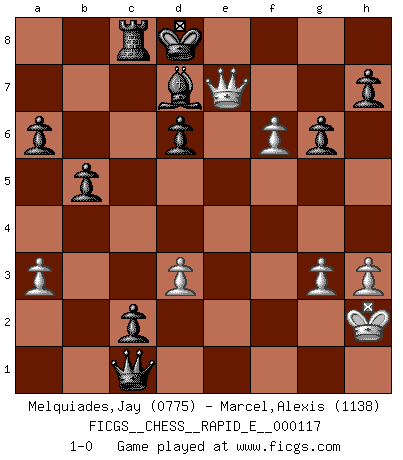 Last move : 1-0 2014 January 15 23:11:32 [Event "FICGS__CHESS__RAPID_E__000117"] [Site "FICGS"] [Date "2013.10.26"] [Round "1"] [White "Melquiades,Jay"] [Black "Marcel,Alexis"] [Result "1-0"] [WhiteElo "0775"] [BlackElo "1138"] 1.e4 g6 2.Nf3 Bg7 3.c3 c5 4.Bc4 Nc6 5.Bxf7+ Kxf7 6.d3 d6 7.Qb3+ Ke8 8.Ng5 Nh6 9.Nd2 Bf6 10.Ndf3 a6 11.h3 Na5 12.Ne6 Bxe6 13.Qa4+ Nc6 14.Bxh6 b5 15.Qc2 Qa5 16.a3 Ne5 17.b4 cxb4 18.O-O bxc3 19.Nd4 Bd7 20.f4 Nc6 21.Nf3 Nd4 22.Nxd4 Bxd4+ 23.Kh1 Qa4 24.Qe2 c2 25.Rac1 Rc8 26.f5 Bb2 27.f6 exf6 28.Bg7 Bxc1 29.Rxc1 Rg8 30.Bxf6 Rf8 31.Kh2 Rxf6 32.e5 Qf4+ 33.g3 Qxc1 34.exf6 Kd8 35.Qe7+ 1-0 This chess game has been lost on time (started : 2013.10.26 10:29:56) Robatsch (Modern) defense Kingside Castling by player White (move 18) Player White won this chess game. Follow this game move after move (download)The defensive power of a pinned piece is only imaginary. (Aaron Nimzovich) Ivan Sokolov treibt mich als Beifahrer an mit go Loeky go - . (Loek van Wely) Un entendimiento minucioso de las típicas continuaciones de mate hacen de las mas complicadas combinaciones de sacrificio que conducen hacia ellas no solo no dificiles, sino casi un asunto de rutina. (Siegbert Tarrasch) Soyez une menace à chaque fois que vous vous asseyez pour jouer. (Ken Smith) As a goal marker shodan is important. As a destination it is a poor place to stop. (Thomas Tamayo)