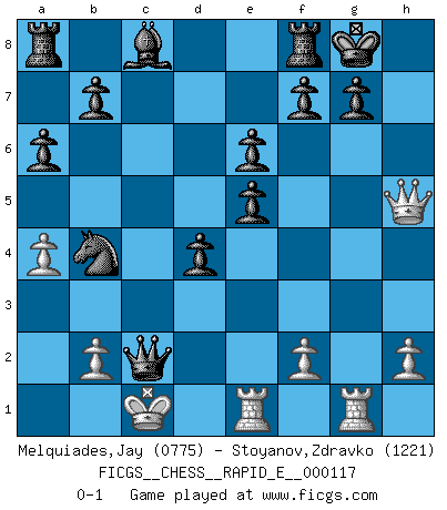 Last move : 0-1 2013 November 4 8:9:39 [Event "FICGS__CHESS__RAPID_E__000117"] [Site "FICGS"] [Date "2013.10.26"] [Round "1"] [White "Melquiades,Jay"] [Black "Stoyanov,Zdravko"] [Result "0-1"] [WhiteElo "0775"] [BlackElo "1221"] 1.e4 c5 2.Nf3 a6 3.Be2 Nc6 4.d4 cxd4 5.e5 e6 6.Bg5 Be7 7.Bxe7 Ngxe7 8.Nbd2 d6 9.a4 dxe5 10.Ng5 O-O 11.Bd3 Ng6 12.Bxg6 Qxg5 13.Bxh7+ Kxh7 14.Ne4 Qxg2 15.Qh5+ Kg8 16.O-O-O Qxe4 17.Rhg1 Nb4 18.Rde1 Qxc2+ 0-1 Sicilian : O'Kelly variation Kingside Castling by player Black (move 10) Queenside Castling by player White (move 16) Player Black won this chess game. Follow this game move after move (download)We must make sure that Chess will not be like a dead language, very interesting, but for a very small group. (Sytze Faber) Eine Person mit durchschnittlichem IQ kann etwa eine ELO von 2000 erreichen. (Jonathan Levitt) Ayuda a tus piezas para que ellas te puedan ayudar. (Paul Morphy) Il n'y a pas eu de défaite parce que je ne crois pas que cet ordinateur ait jamais existé. IBM a triché en refusant d'imprimer les modes de recherche de la machine. C'est évident, pendant le match, des coups décisifs ont été joués par des êtres humains. Aujourd'hui, les meilleurs spécialistes en informatique ne peuvent toujours pas expliquer comment Deep-Blue a pu jouer contre la logique des ordinateurs. IBM a gagné une guerre de communication, mais ils sont incapables de prouver que l'ordinateur a gagné tout seul. (Garry Kasparov) Fame, I have already. Now I need the money. (an elderly Steinitz)
