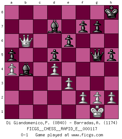 Last move : 0-1 2013 November 24 20:50:25 [Event "FICGS__CHESS__RAPID_E__000117"] [Site "FICGS"] [Date "2013.10.26"] [Round "1"] [White "Di Giandomenico,Pierino"] [Black "Barradas,Anderson"] [Result "0-1"] [WhiteElo "0840"] [BlackElo "1174"] 1.d4 d5 2.Bd2 Nf6 3.Nc3 e6 4.e3 Bd6 5.Bb5+ Bd7 6.Nf3 c6 7.Ba4 a6 8.O-O b5 9.Bb3 a5 10.a4 b4 11.Ne2 Ne4 12.Nf4 c5 13.c3 c4 14.Bc2 Nc6 15.cxb4 Nxb4 16.Re1 Nxd2 17.Qxd2 Nxc2 18.Qxc2 Rc8 19.b3 Bb4 20.Nd2 cxb3 21.Qxb3 Bxd2 22.Red1 Bb4 23.Nd3 Rc3 24.Qb2 O-O 25.Nc5 Kh8 26.Nb7 Qg5 27.Rdc1 Rfc8 28.Nd6 Rxc1+ 29.Rxc1 Rxc1+ 30.Qxc1 Bxd6 31.Qb1 h5 32.Qb6 Bb4 0-1 Queen's pawn game Kingside Castling by player White (move 8) Kingside Castling by player Black (move 24) Player Black won this chess game. Follow this game move after move (download)Chess, like any creative activity, can exist only through the combined efforts of those who have creative talent, and those who have the ability to organize their creative work. (Mikhail Botvinnik) Bis jetzt ist Weiß einer wohlbekannten Analyse gefolgt. Aber jetzt begeht er einen schrecklichen Fehler: Er beginnt seinen eigenen Kopf zu benutzen. (Siegbert Tarrasch) El Ajedrez es tan inspirador que yo no creo que un buen jugador sea capaz de tener un pensamiento malo durante una partida. (Wilhelm Steinitz) J'apprécie les joueurs d'est-indienne, c'est grâce à eux que je nourris ma famille depuis tant d'années. (Petrosian) A generalist learns less and less about more and more until he knows nothing about everything. (Author unknown)