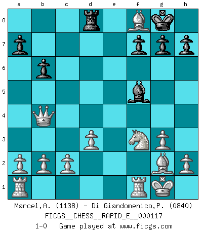 Last move : 1-0 2013 November 8 13:5:39 [Event "FICGS__CHESS__RAPID_E__000117"] [Site "FICGS"] [Date "2013.10.26"] [Round "1"] [White "Marcel,Alexis"] [Black "Di Giandomenico,Pierino"] [Result "1-0"] [WhiteElo "1138"] [BlackElo "0840"] 1.f4 e6 2.Nf3 Qh4+ 3.g3 Qf6 4.Bg2 Bd6 5.e4 Ne7 6.e5 Qg6 7.exd6 cxd6 8.O-O O-O 9.d3 Nf5 10.Qe1 e5 11.fxe5 dxe5 12.Nxe5 Qe6 13.Nc3 d6 14.Nf3 Nc6 15.Bf4 Qd5 16.Nxd5 Be6 17.Ne3 Nb4 18.Qxb4 b6 19.Nxf5 Bxf5 20.Bxd6 Rad8 21.Bxf8 1-0 Bird's Opening Kingside Castling by player White (move 8) Kingside Castling by player Black (move 8) Player White won this chess game. Follow this game move after move (download)What is the difference between chess and football? Everybody understands football, but nobody plays it. Everybody plays chess, but nobody understands it. Everything is relative. (Vladimir Kramnik) Man wirke der falschen Auffassung entgegen, als ob jeder Zug Unmittelbares zu leisten habe; auch Werte- und Ruhezüge haben ihre Existenzberechtigung. (Aaron Nimzowitsch) Hay dos clases de hombres: aquellos que se conforman en dejarse llevar por las circunstancias y que juegan barajas y aquellos decididos a controlar las circunstancias y que juegan al Ajedrez. (Mortimer Collins) Aidez vos pièces, elles vous aideront. (Paul Morphy) Luck is what you have left over after you give 100 percent. (Langston Coleman)