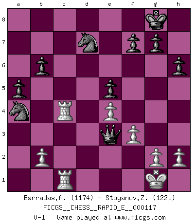 Last move : 0-1 2013 November 6 15:36:47 [Event "FICGS__CHESS__RAPID_E__000117"] [Site "FICGS"] [Date "2013.10.26"] [Round "1"] [White "Barradas,Anderson"] [Black "Stoyanov,Zdravko"] [Result "0-1"] [WhiteElo "1174"] [BlackElo "1221"] 1.e4 c5 2.Nf3 a6 3.d4 cxd4 4.Nxd4 e5 5.Nb3 Nc6 6.Nc3 h6 7.Be2 Nf6 8.Be3 Bb4 9.Bd2 O-O 10.Bd3 d6 11.O-O Be6 12.a3 Bxb3 13.axb4 Nxb4 14.cxb3 Nxd3 15.Bc1 Nc5 16.Re1 Qb6 17.b4 Qxb4 18.Qxd6 a5 19.f3 Rfe8 20.Rb1 Rad8 21.Qc7 Rd7 22.Qxd7 Nfxd7 23.Rd1 Qb6 24.Be3 Qc7 25.Nb5 Qb6 26.Nd6 Re6 27.Nc4 Qb5 28.Na3 Qe2 29.Re1 Qd3 30.Rbd1 Qb3 31.Rc1 b6 32.Re2 Na4 33.Nc4 Rc6 34.Rec2 Rxc4 35.Rxc4 Qxe3+ 0-1 Sicilian : O'Kelly variation Kingside Castling by player Black (move 9) Kingside Castling by player White (move 11) Player Black won this chess game. Follow this game move after move (download)The mistakes are there, waiting to be made. (Savielly Tartakower) Nicht daß Diemer aus Opportunismus Mitglied der NSDAP geworden wäre. Er war ein Fanatiker, in allem, was er tat. (Hans Ree) En la vida, como en el Ajedrez, los Peones propios obstruyen nuestro camino. La gran fortuna de un hombre, su comodidad, placer, hijos, libros, que deberían ayudarle a ganar, con mucha frecuencia lo ponen en Jaque Mate. (Charles Buxton) Les échecs, c'est la lutte contre l'erreur. (Johannes Zukertort) Every now and then a man's mind is stretched by a new idea and never shrinks back to its former dimensions. (Oliver Wendell Holmes, Sr.)
