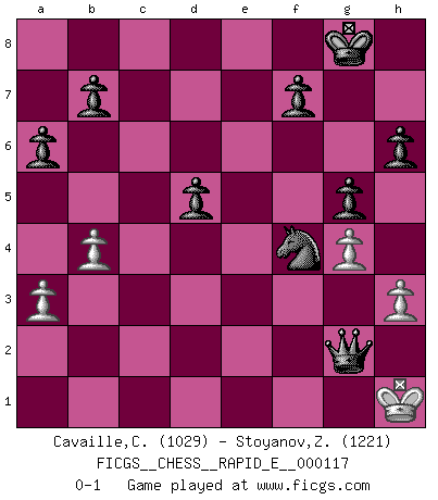 Last move : 0-1 2013 October 27 21:17:14 [Event "FICGS__CHESS__RAPID_E__000117"] [Site "FICGS"] [Date "2013.10.26"] [Round "1"] [White "Cavaille,Cedric"] [Black "Stoyanov,Zdravko"] [Result "0-1"] [WhiteElo "1029"] [BlackElo "1221"] 1.d4 d5 2.Nc3 c6 3.e4 a6 4.exd5 cxd5 5.Nf3 Bg4 6.Be2 e6 7.O-O Bb4 8.Qd3 Nc6 9.a3 Ba5 10.Nd1 Nf6 11.b4 Bb6 12.c3 Ne4 13.Nd2 Bxe2 14.Qxe2 Nf6 15.Nf3 Ne4 16.Qd3 O-O 17.Nd2 Nf6 18.Nf3 Ne4 19.c4 h6 20.cxd5 exd5 21.Bb2 Re8 22.Re1 Qf6 23.Bc3 Re6 24.Nb2 Rae8 25.Rad1 Nxc3 26.Qxc3 Bxd4 27.Nxd4 Rxe1+ 28.Rxe1 Rxe1+ 29.Qxe1 Nxd4 30.Qd2 Qh4 31.Nd3 Qg4 32.Kf1 Nb3 33.Qe2 Qc4 34.h3 Nd4 35.Nb2 Qxe2+ 36.Kg1 Qxb2 37.g4 Ne2+ 38.Kg2 Nf4+ 39.Kg3 g5 40.Kh2 Qxf2+ 41.Kh1 Qg2+ 0-1 Queen's pawn : Chigorin variation Kingside Castling by player White (move 7) Kingside Castling by player Black (move 16) Player Black won this chess game. Follow this game move after move (download)The older I grow, the more I value pawns. (Paul Keres) Die starken Figuren des Gegners muss man abtauschen. (José Raúl Capablanca) El Ajedrez lo es todo: arte, ciencia y deporte. (Anatoly Karpov) Si rien de grave n'est détecté lors de l'analyse d'une position, on joue alors le coup. Seconde règle de Blumenfeld. Unless I accept my faults I will most certainly doubt my virtues. (Hugh Prather)
